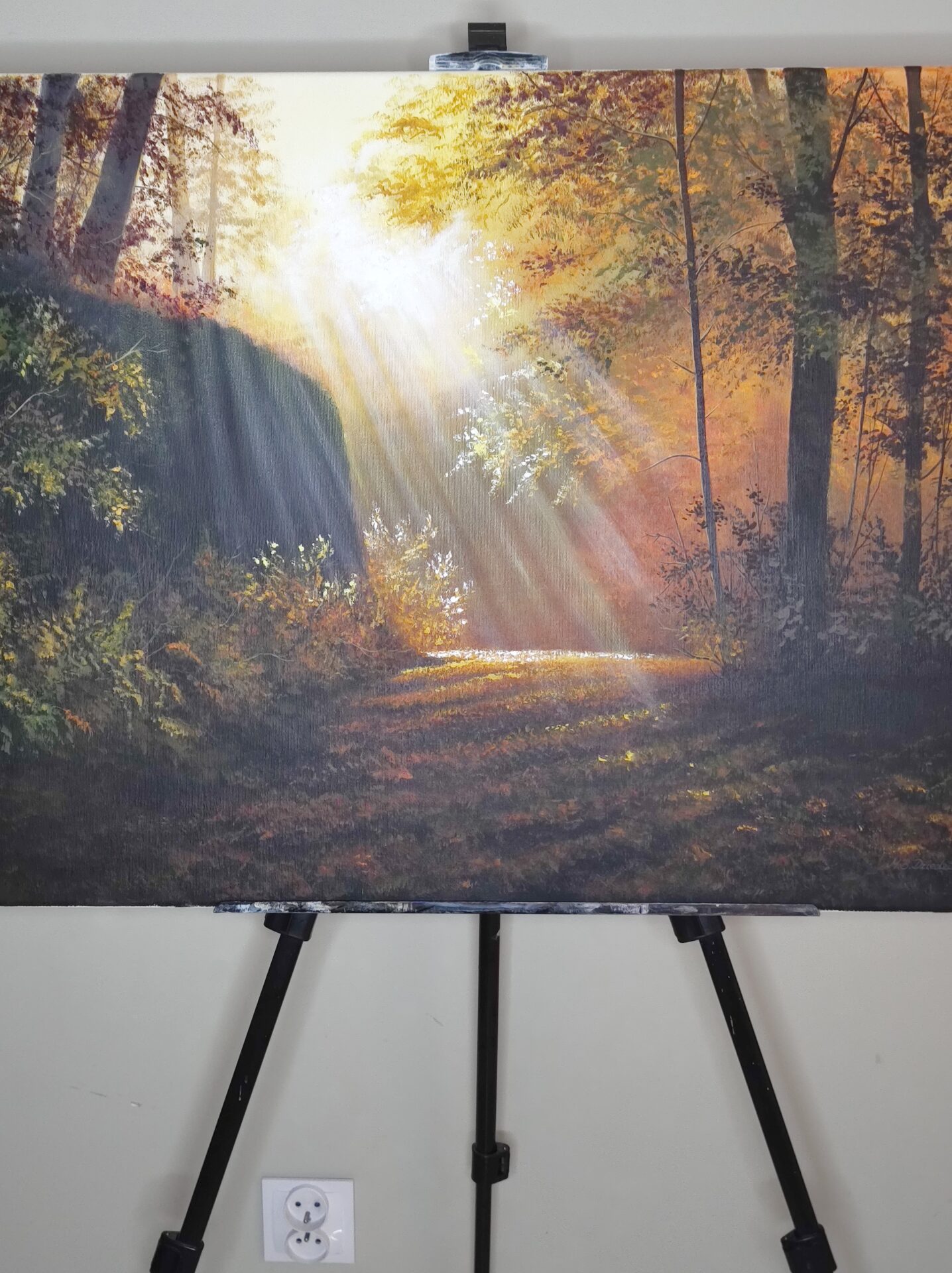 Obraz mojego autorstwa, namalowany profesjonalnymi farbami akrylowymi na bawełnianym podobraziu malarskim pokrytym grubym włoskim płótnem o doskonałej jakości. Wykończony i zabezpieczony werniksem z połyskiem. Podpis autora znajduje się na awersie i rewersie. Wymiary 60 x 80 cm. Boki obrazu zostały zamalowane zgodnie z kolorystyką całości. Obraz wykonany został pędzlem i szpachlą. Praca prezentuje się bardzo efektownie i będzie pasowała do każdego rodzaju wnętrza. Wszystkie materiały użyte do stworzenia obrazu są wysokiej jakości.