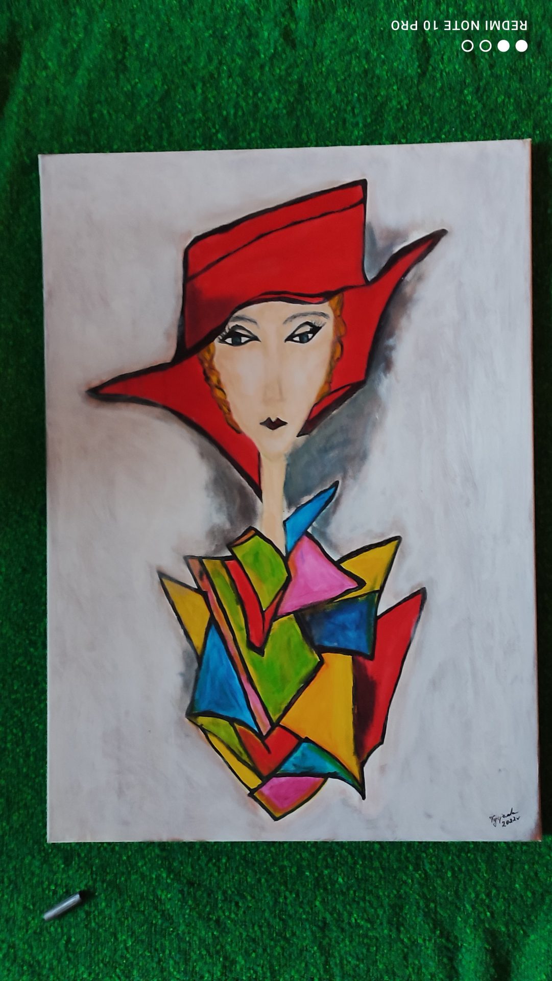 Obraz w stylu kubizmu, akryl na płótnie 50x70cm Kobieta w czerwonym kapeluszu, sygnowany