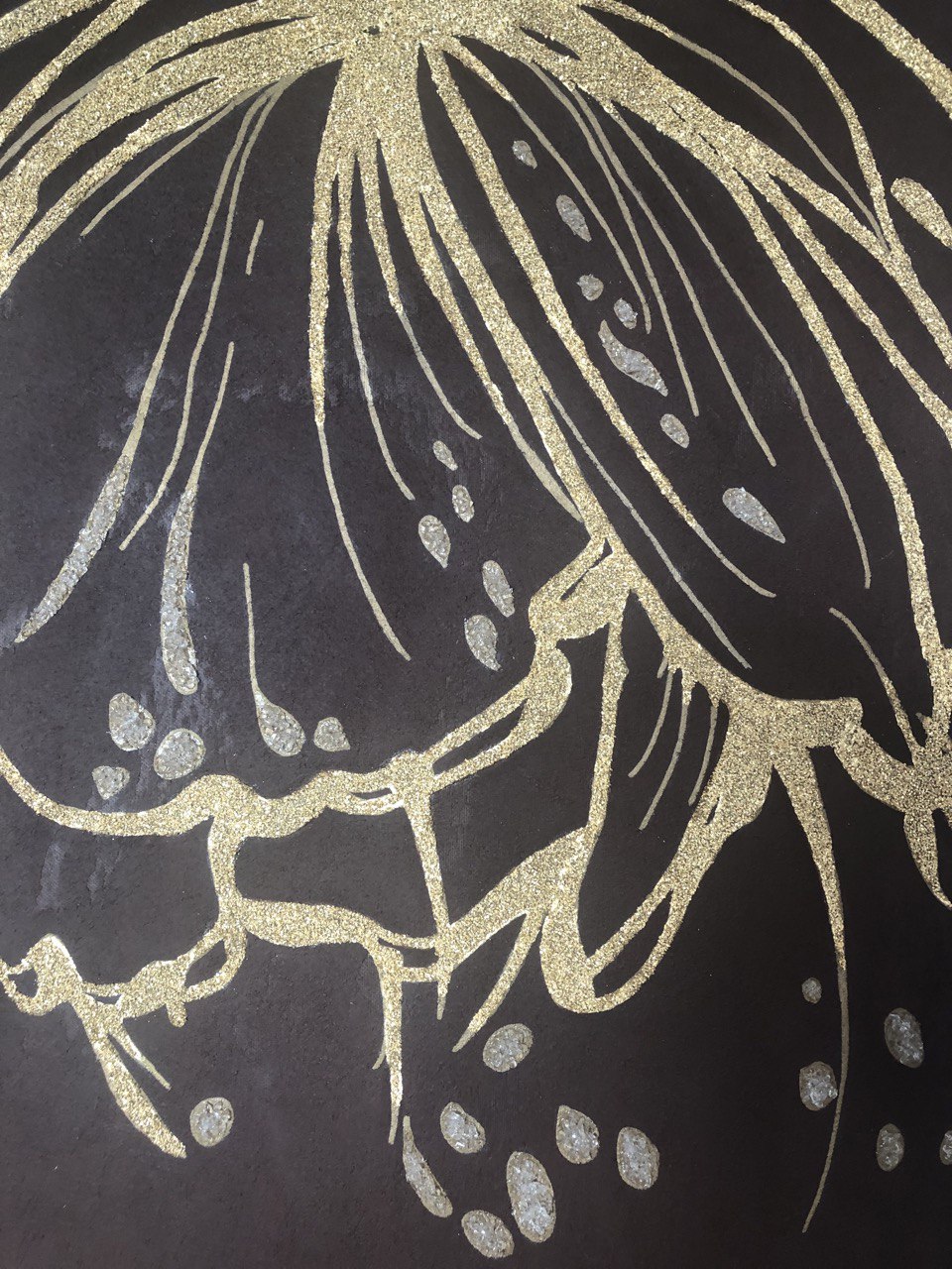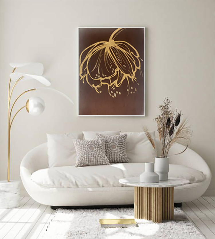 Оригінальна акрилова картина ручного розпису на полотні. Відмітний золотистий колір привертає увагу і погляд негрубою текстурою фарби. Картини з квітами підходять до будь-якого інтер’єру. Чудова ідея для подарунка Кольори: золото, шоколад. в рамці. Готово повісити.Акрилова картина прикрашена золотими пластівцями з додаванням декоративного піску і скляних гранул Оригінальна картина за підписом художника.Сердечно рекомендую.