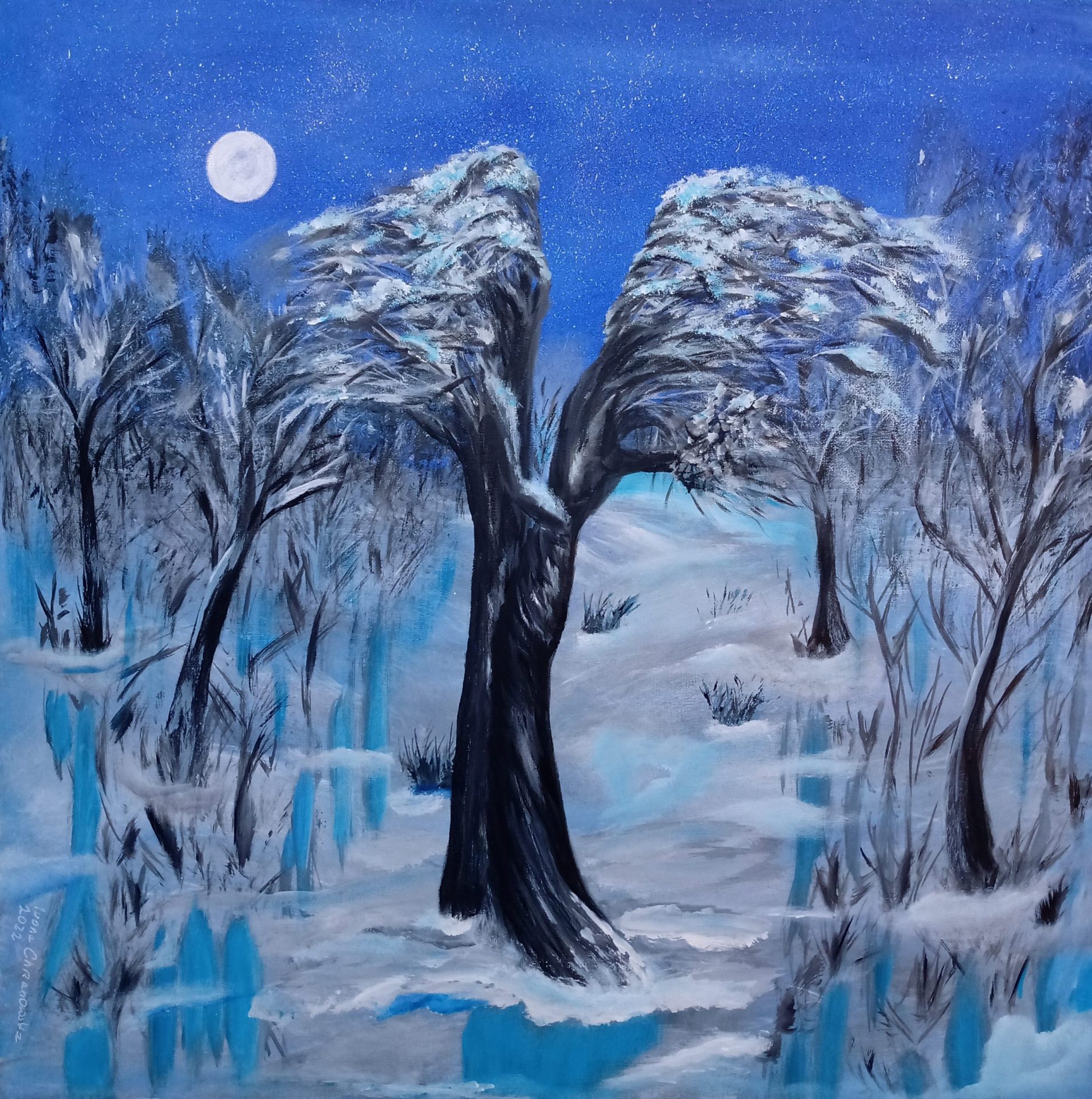 Unikalny, autorski, wg własnego pomysłu obraz „Zimowy taniec drzew” malowany farbami akrylowymi na płótnie, własna kompozycja i inspiracja. Boki są zamalowane, wykończony werniksem. Na życzenie mogę oprawić w ramkę. Wszystkie moje obrazy mają zawieszki i są wykończone werniksem.