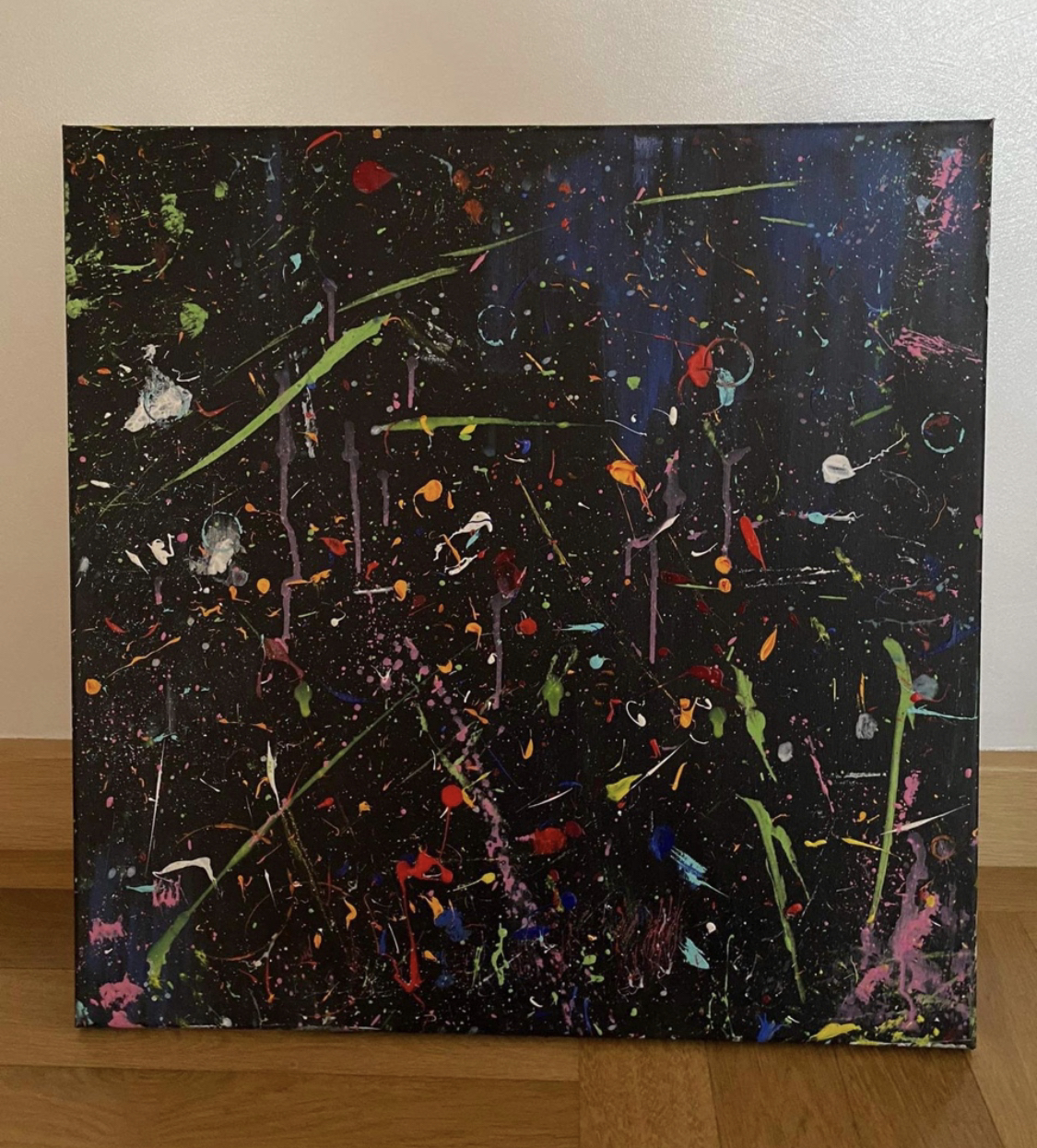 Obraz namalowany na płótnie farbami akrylowymi. Dzieło przedstawia abstrakcje.