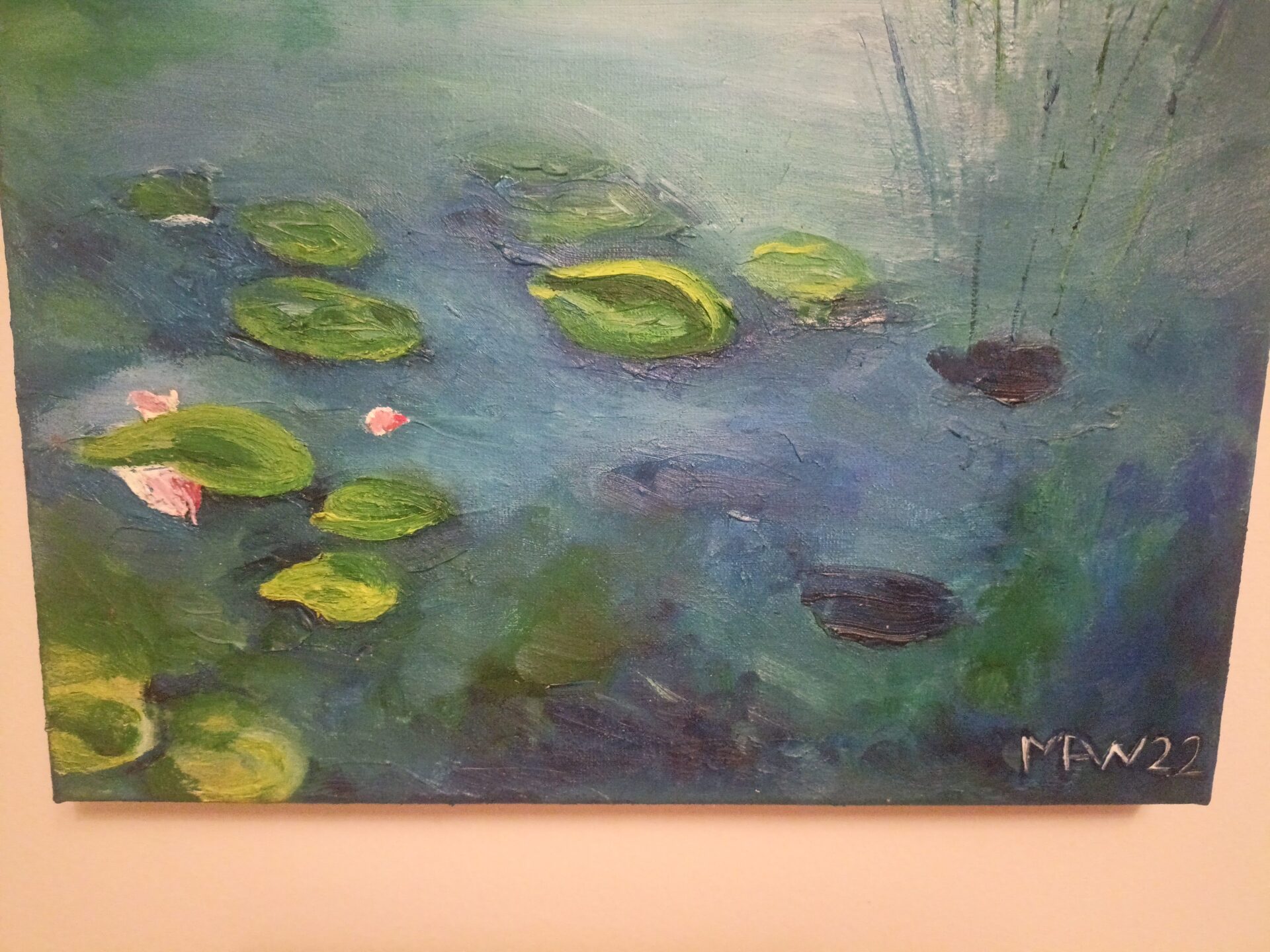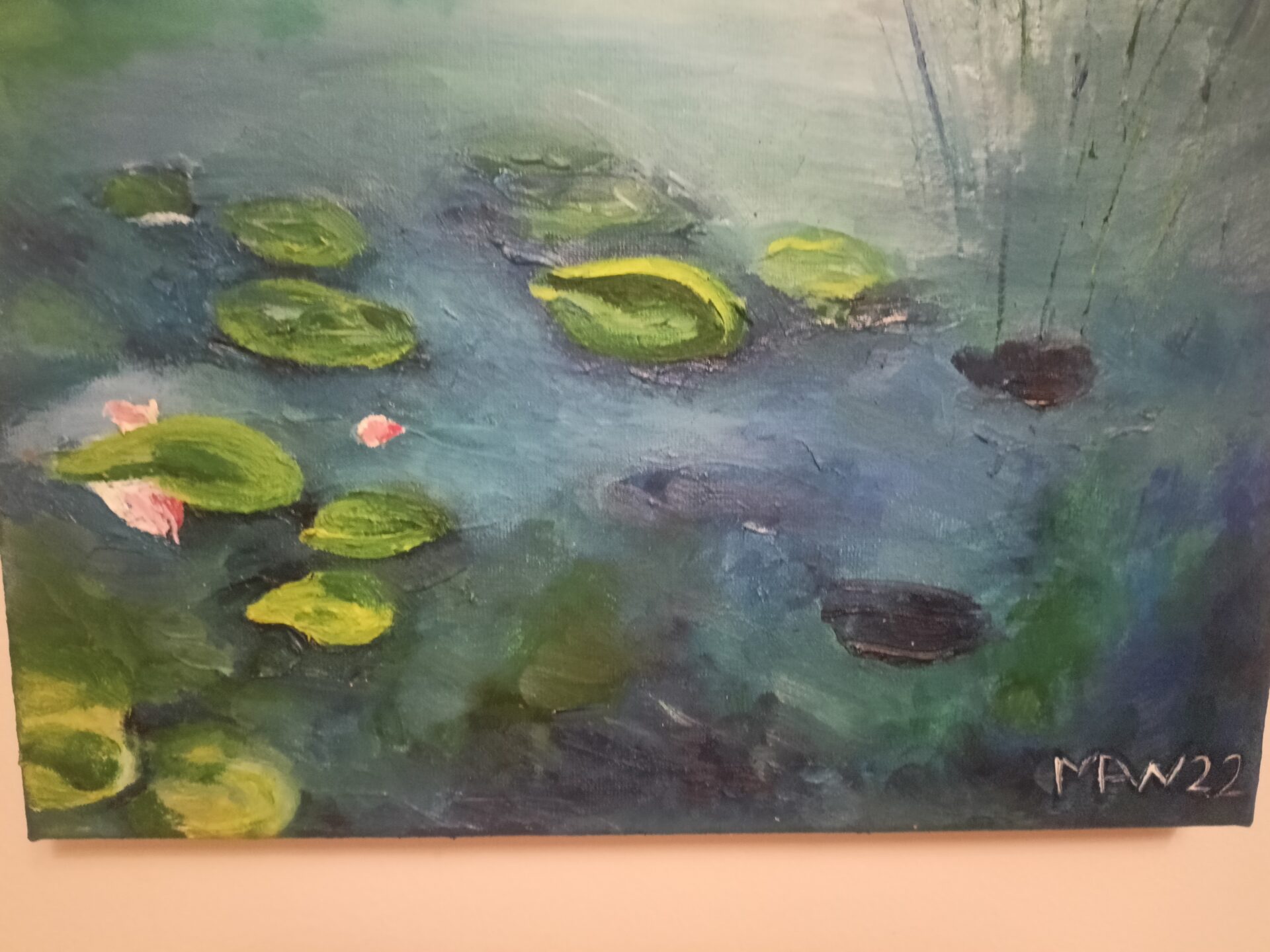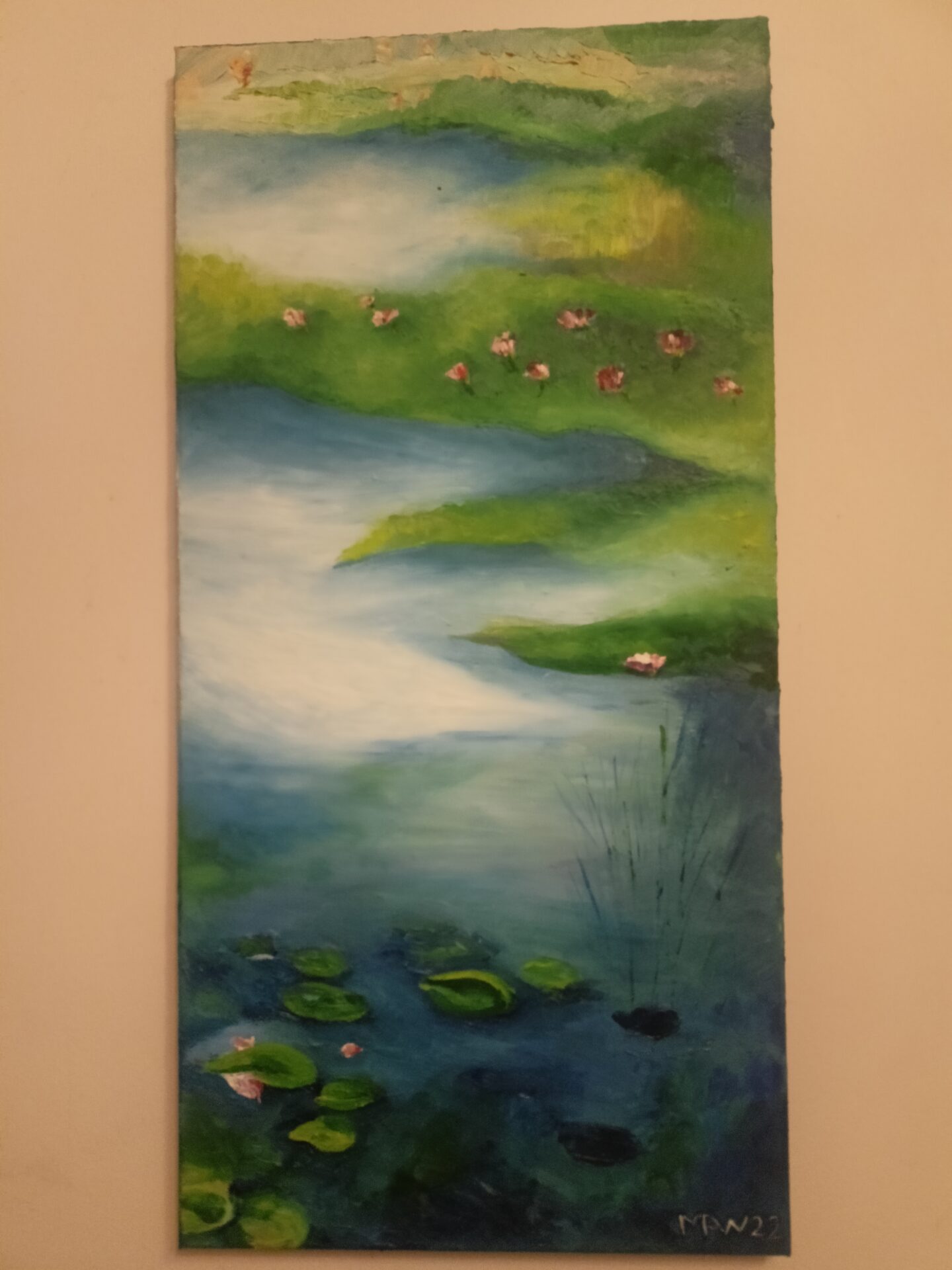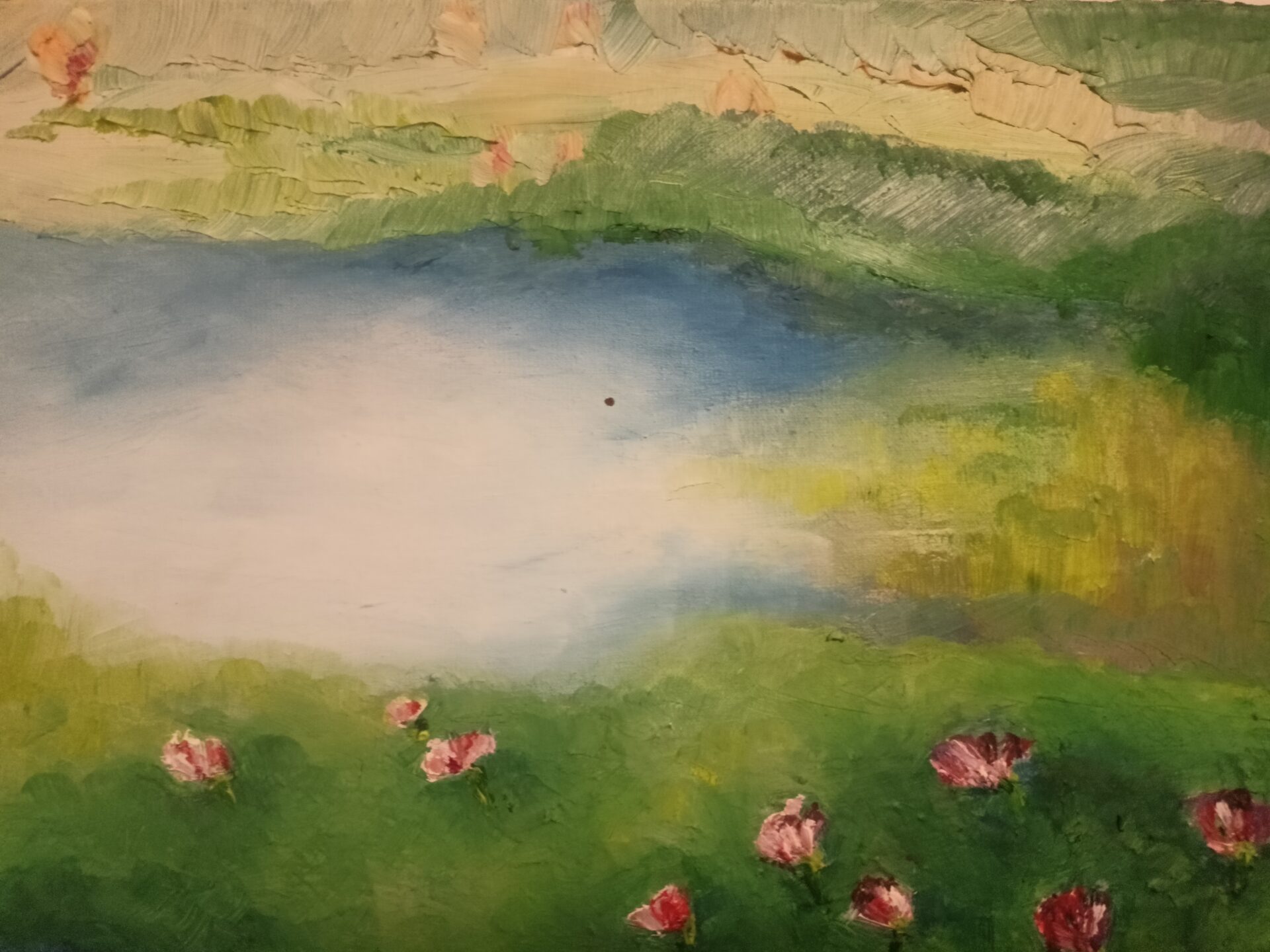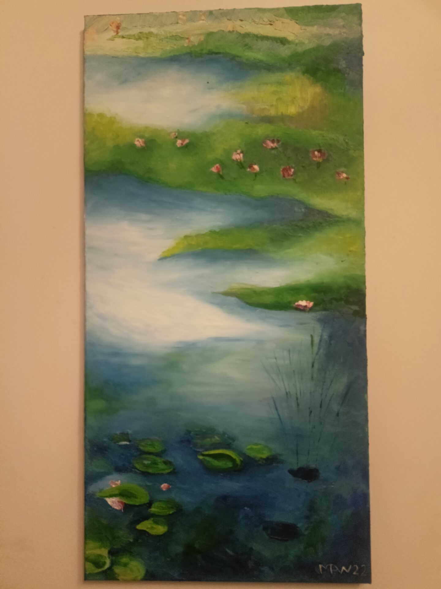 Obraz olejny na płótnie, boki zamalowane, przedstawia taflę jeziora, malowany z wyobraźni