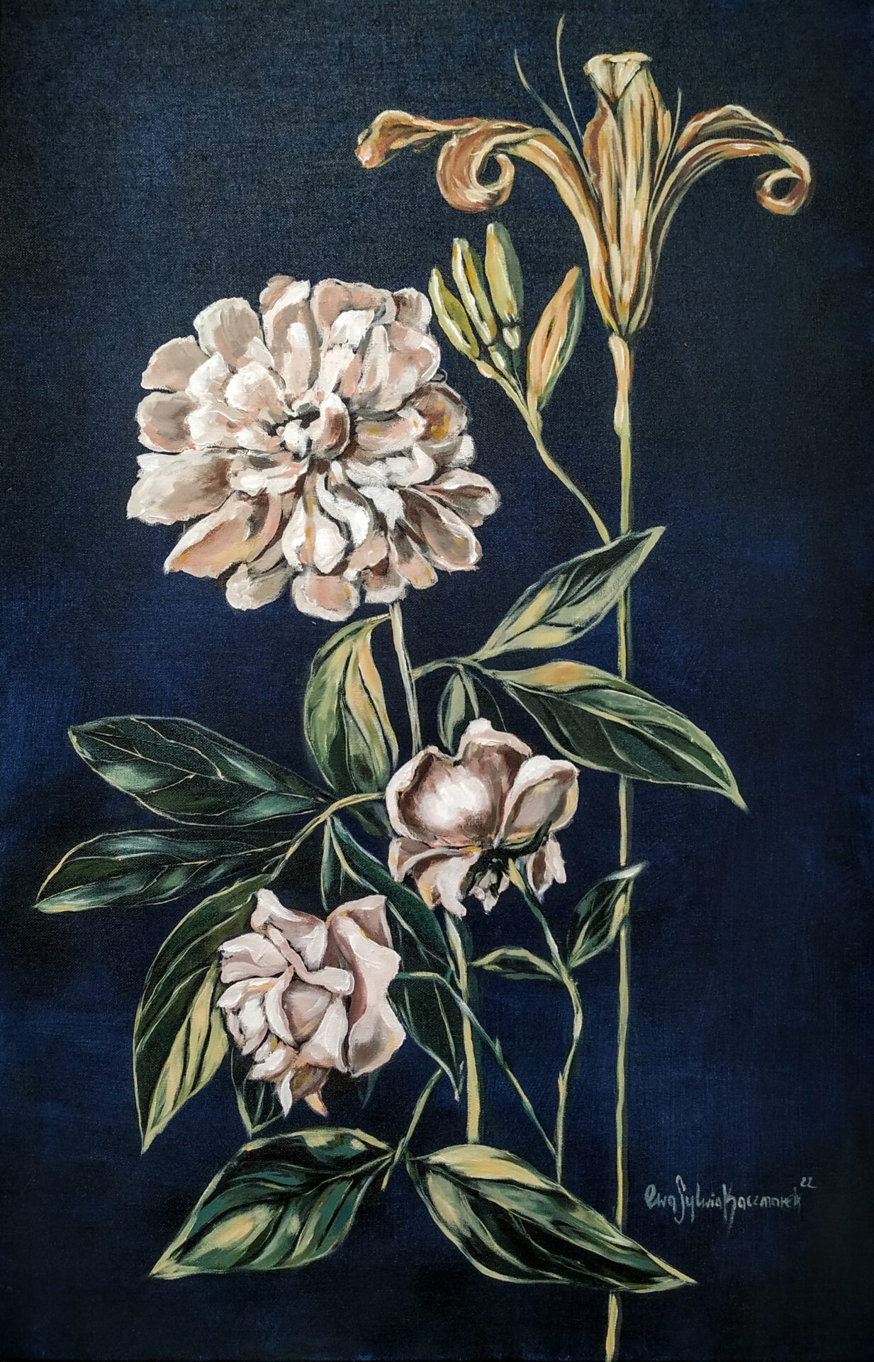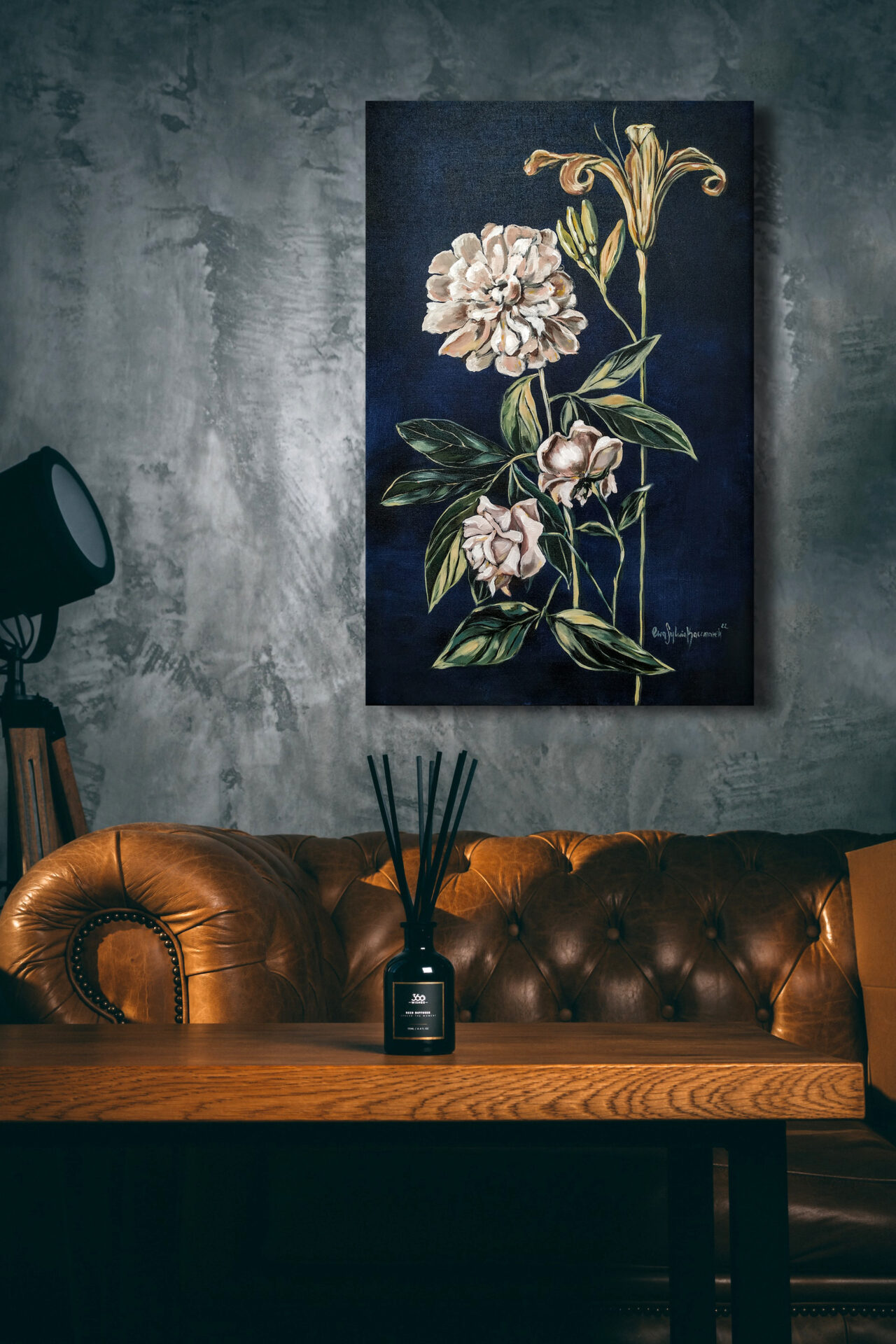 Obraz akrylowy na płótnie bawełnianym z motywem kwiatowym.