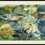 Akwarela na papierze, wymiar w oprawie 140 cm na 80 cm, akwarela to impresje związane z życiem podwodnym zwierząt. Obraz stanowi cykl akwarel przedstawiających tematykę morską. Jestem artysta związanym z morzem i tematyka morska jest moją naturalną wypowiedzią artystyczną.