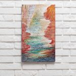 W centrum obrazu widzimy mieniącą się taflę wody, która zdaje się być zwierciadłem jesiennego nieba. Przenikające się odcienie czerwieni, pomarańczy i złota, mieszają się z subtelnymi błękitami i zieleniami, tworząc symfonię barw, które łagodnie rozlewają się po powierzchni. Wodna tafla, pokryta delikatnymi, falującymi liniami, odbija krajobraz pełen jesiennych liści, jakby szeptała o przemijaniu i odradzaniu się.