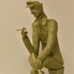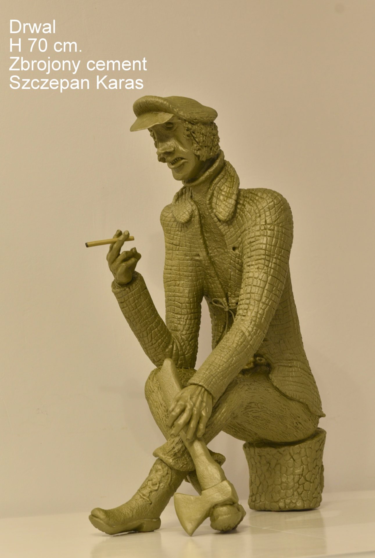 Postać odpoczywającego siedzącego na pieńku drwala palącego papierosa wykonana ze zbrojonego cementu pomalowana metaliczną farbą.