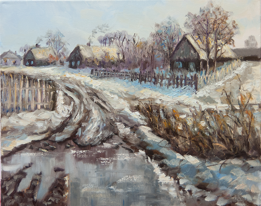 Obraz olejny na podobraziu płóciennym w technice alla prima z widoczną fakturą farby.