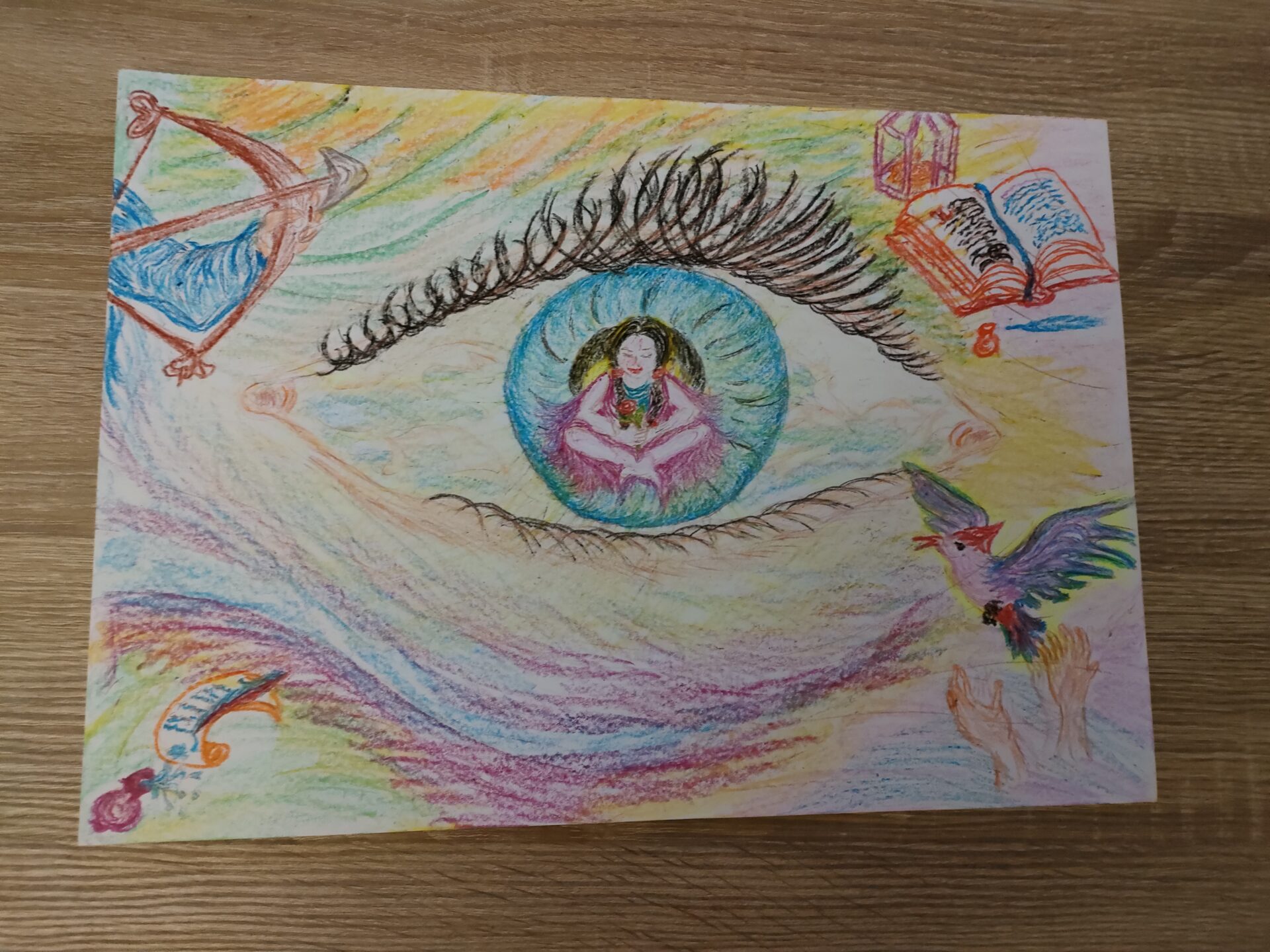 Rysunek wykonany kredka o formacie A5. Ukazuje oblicze obserwatora na tle zmieniających się wydarzeń.