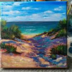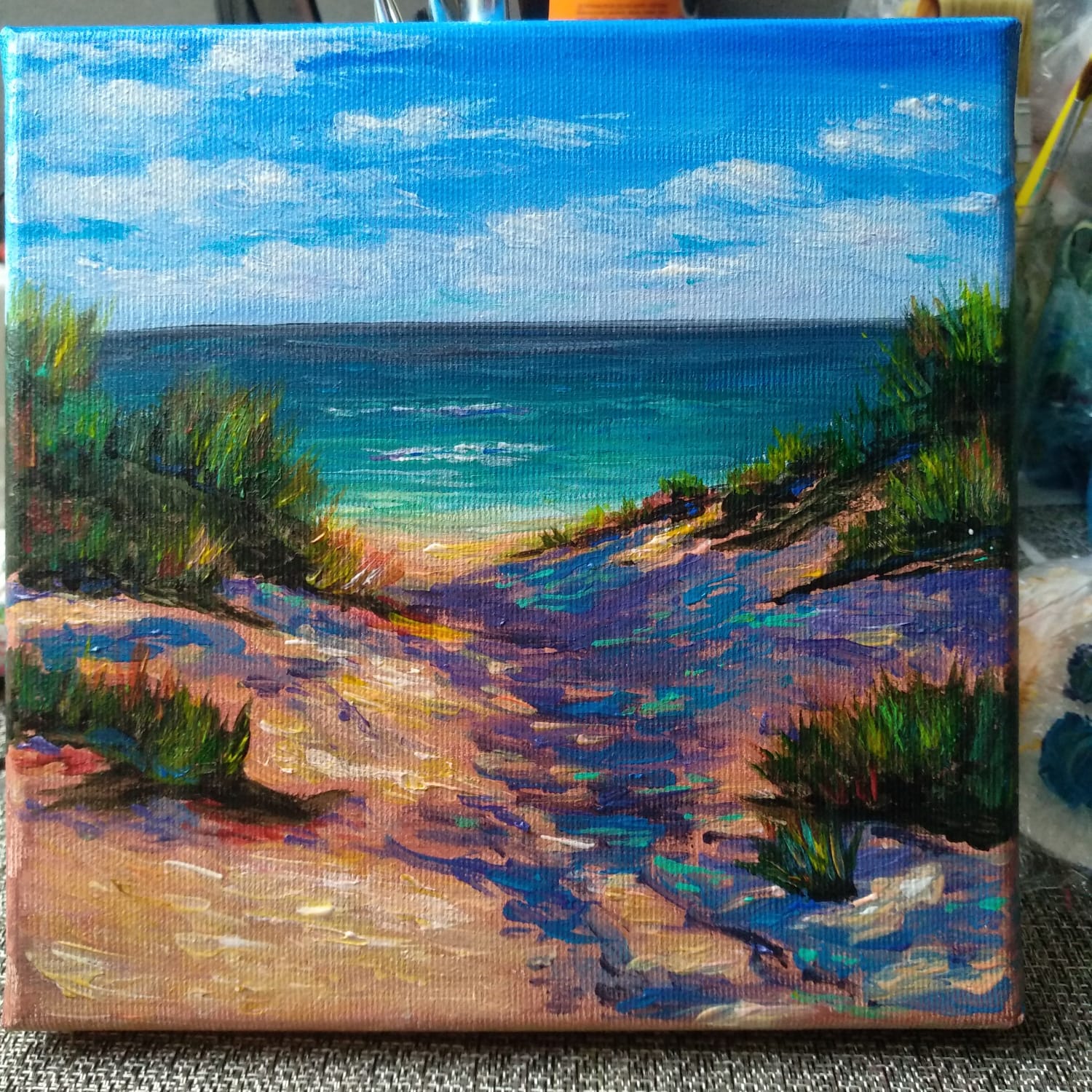 Obraz wydmy to niewielkie ale wyjątkowe dzieło . Piękna gra kolorów , klimat nadmorski.