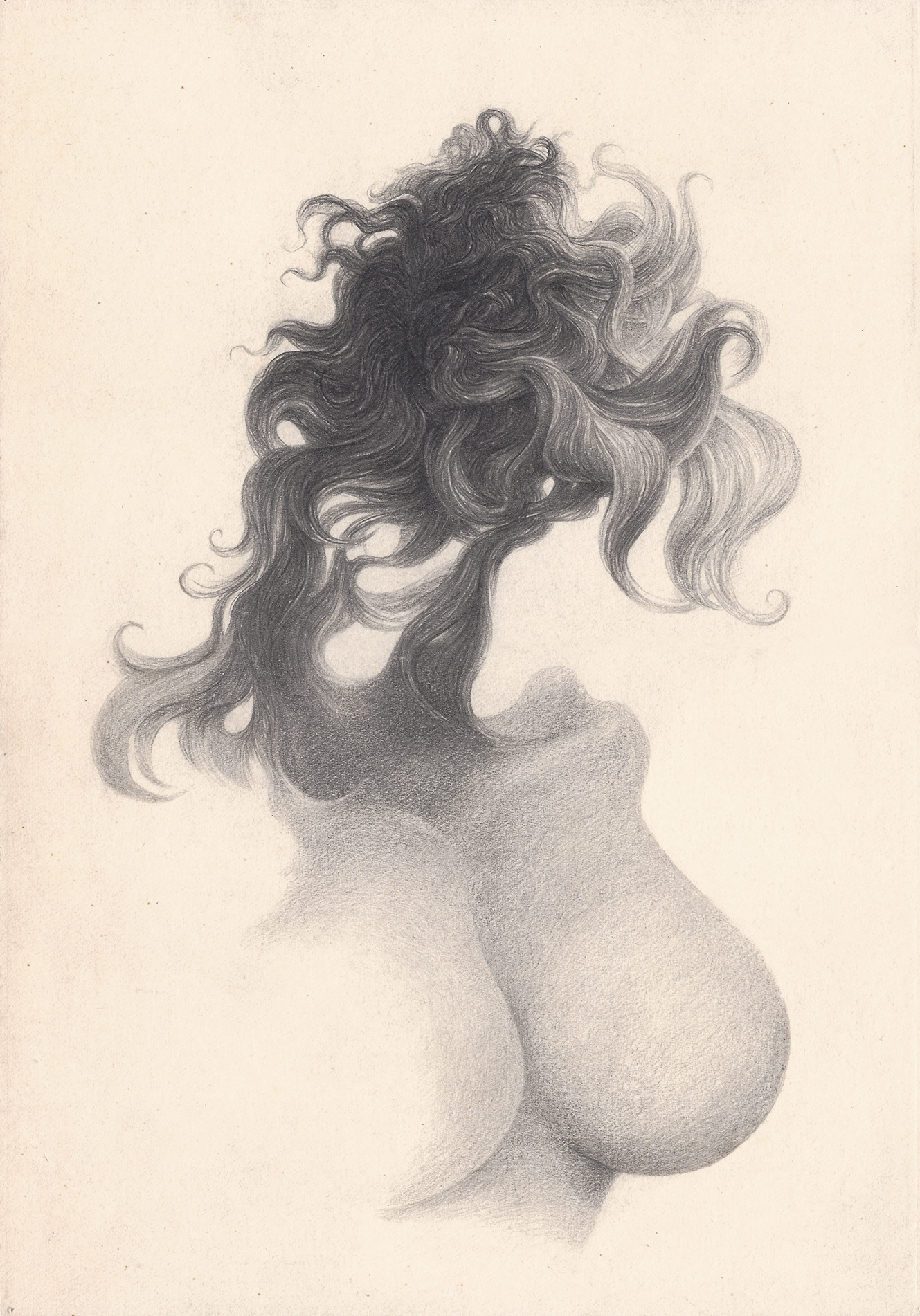 Obecność kobiety jest eteryczna, a jej spojrzenie, choć pozbawione oczu, zdaje się emanować z głębi misternej plątaniny włosów. Wyrzeźbione z marzeń piersi płynnie przechodzą w nicość, pozostawiając za sobą czyste pragnienie.