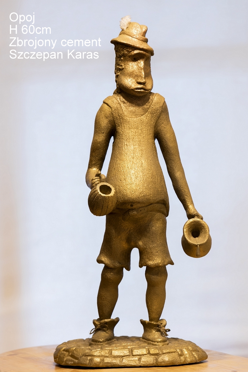 Postać pijaka-opoja nieco niechlujnie odzianego w przykrótkim podkoszulku z wydatnym brzuchem i kuflem w jednej a dzbanem w drugiej ręce kapelusz z piórkiem i zgrzebne gacie to groteskowy obraz pijackiej beztroski.