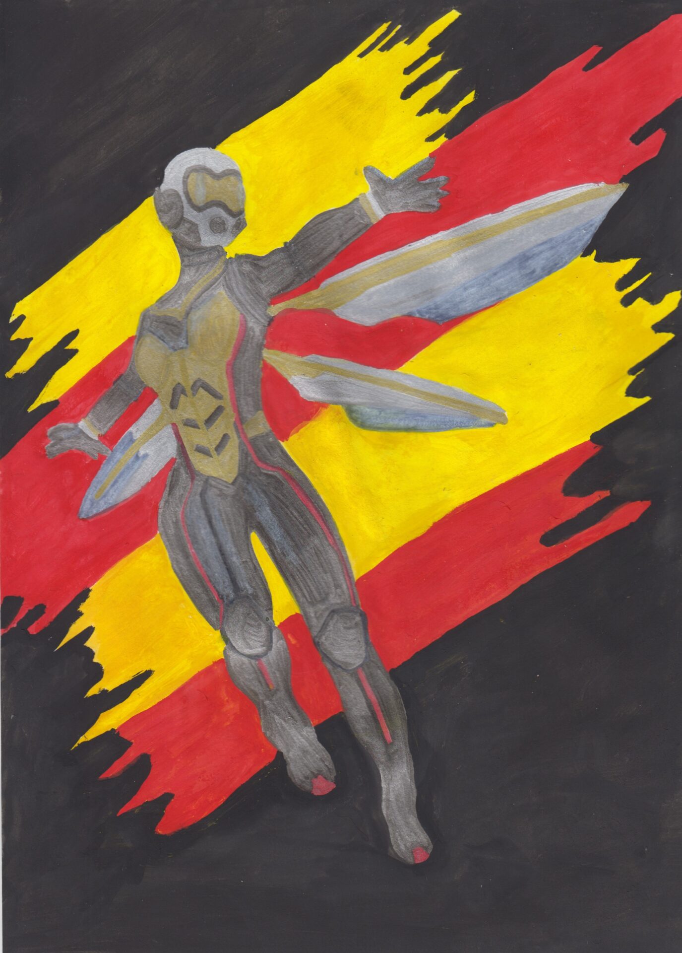 Rysunek przedstawia jedną z bohaterek Marvela z filmu Ant-man. Jest pomalowana metalicznymi mazakami a tło pomalowane farbami na kartce a4.