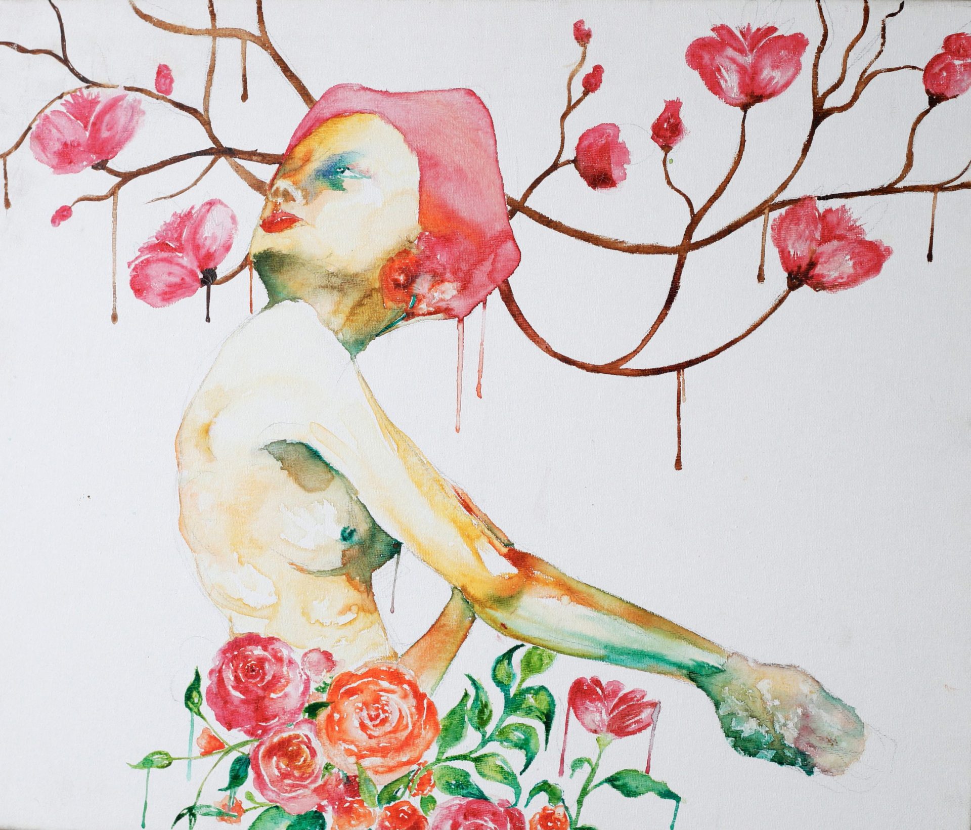 „Otwieram wspomnienie” Obraz ukazuje nagą kobietę, której ciało okalają róże. Myśli cofają się do tamtego zdarzenia. Kiedy chciała go zobaczyć, zamykała oczy. Kiedy chciała go poczuć, otwierała wspomnienie ostatniego razu, gdy dotknął jej zmysłów. Kolorystyka ma oddawać atmosferę miłych skojarzeń, jakie przeszłość wywarła na naszą bohaterkę. Lecz zamknięta w minionych zdarzeniach nie patrzy naprzód, w przyszłość, lecz topi się we wspomnieniach woni jego skóry – bo tylko tak doprowadza się do błogostanu. Technika: akwarela na płótnie, wymiary:50cmx60cm , rok:2018,