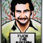“Pablo Escobar FTS”, to kadr ze słynnego zdjęcia w areszcie, kolumbijskiego, kontrowersyjnego przedsiębiorcy. Z pewnością system nie był w kręgu behawioralno-społecznych zainteresowań Pablo, co wyraziłem na tabliczce, zastępując oryginalnie nadany numer aresztowanego, podczas zatrzymania Escobara. W tle pną się liście koki, które zaniosły Pablo Escobara na sam szczyt branży przemytniczej na świecie.