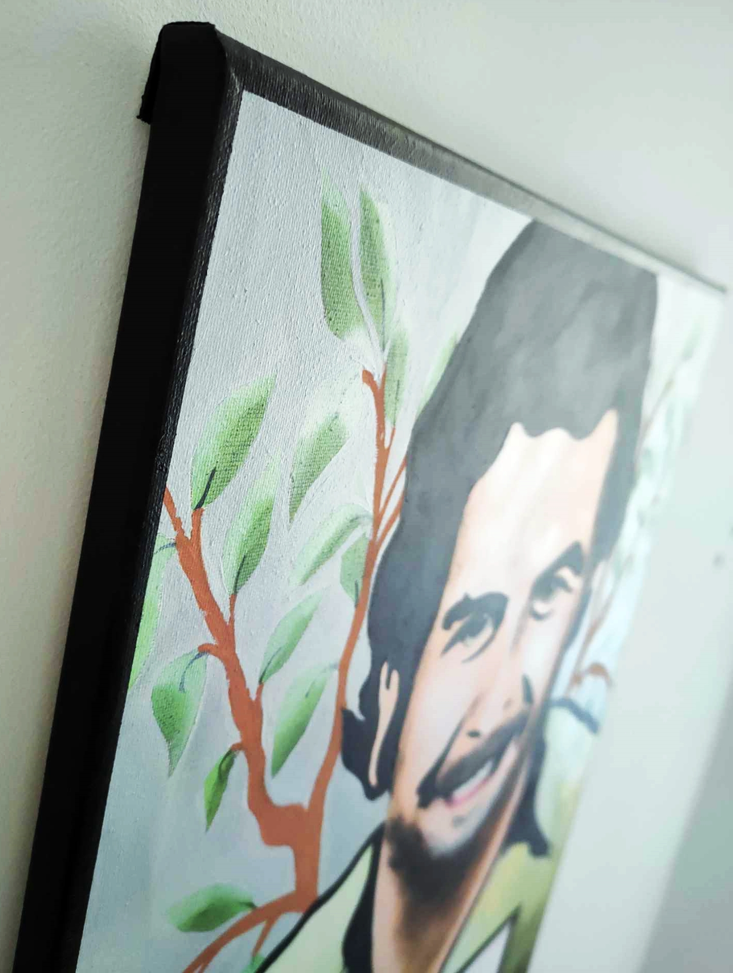 Obraz posiada zamalowane boki, co zwalnia z potrzeby oprawy. Wykonany za pomocą pędzli, farb akrylowych, stempli, oraz farby w spreju.