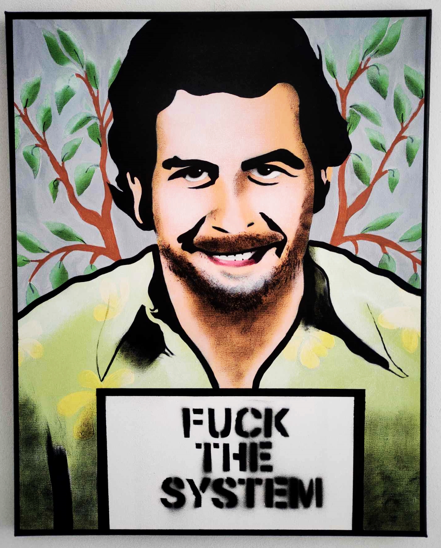 “Pablo Escobar FTS”, to kadr ze słynnego zdjęcia w areszcie, kolumbijskiego, kontrowersyjnego przedsiębiorcy. Z pewnością system nie był w kręgu behawioralno-społecznych zainteresowań Pablo, co wyraziłem na tabliczce, zastępując oryginalnie nadany numer aresztowanego, podczas zatrzymania Escobara. W tle pną się liście koki, które zaniosły Pablo Escobara na sam szczyt branży przemytniczej na świecie.