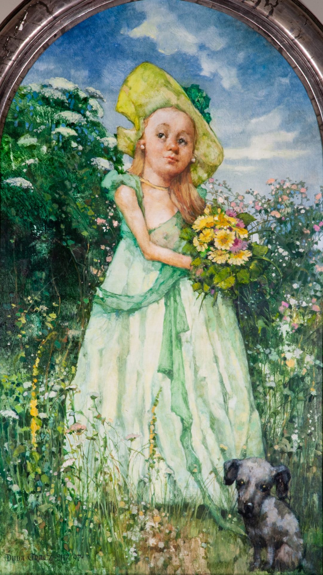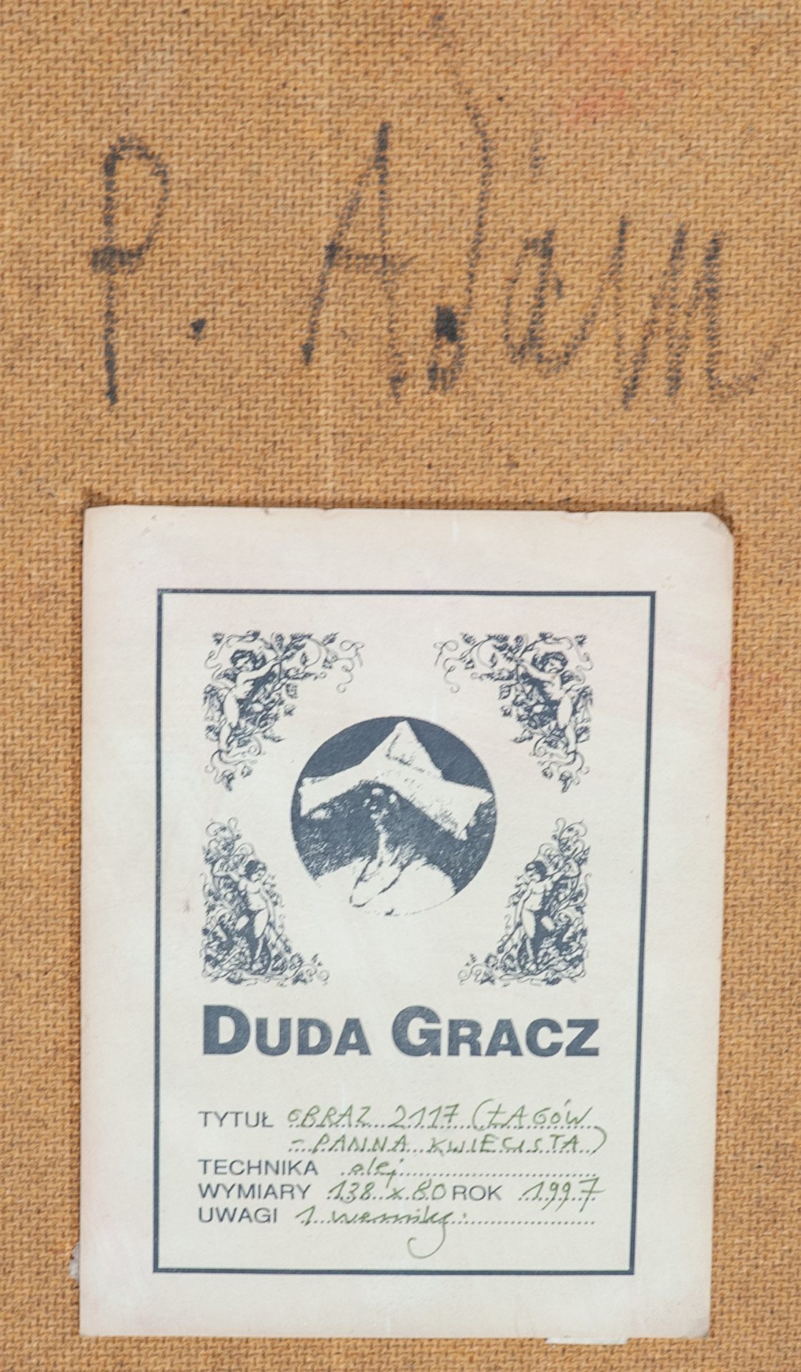 Poniżej nalepka: DUDA GRACZ | TYTUŁ Obraz 2117 (ŁAGÓW | PANNA KWIECISTA) | TECHNIKA olej | WYMIARY 138 x 80 ROK 1997