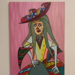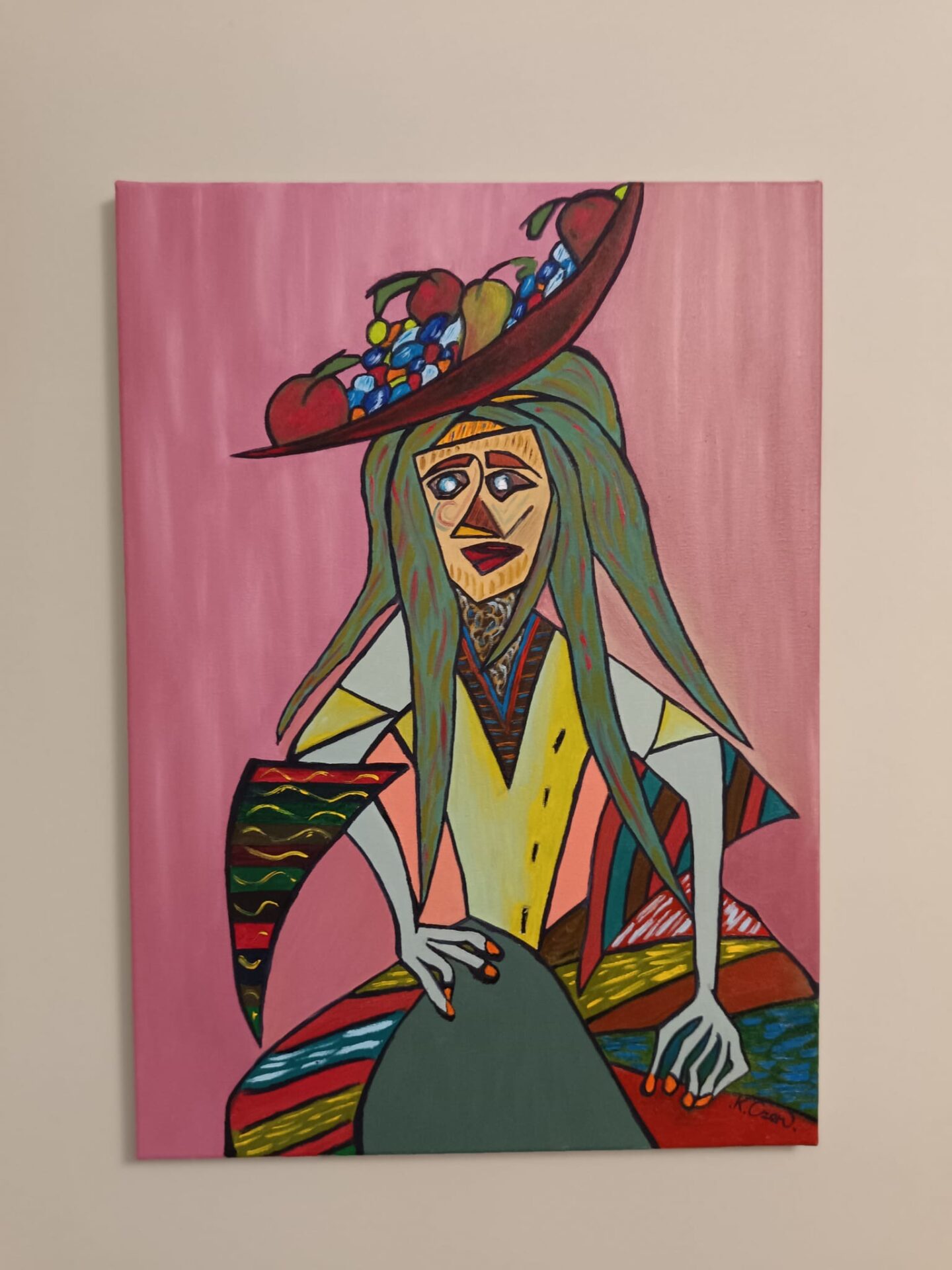 Obraz inspirowany stylem kubizmu przedstawia postać kobiety z misą pełną owoców na głowie. Mocne linie, geometryczne kształty i intensywne kolory nadają kompozycji wyrazistość i ekspresję. Dominujące odcienie różu w tle kontrastują z wielobarwnym strojem i akcesoriami, tworząc dynamiczną harmonię. Wyraz twarzy kobiety, przerysowany i pełen emocji, zdaje się opowiadać historię, zachęcając widza do refleksji nad symboliką i ukrytymi znaczeniami dzieła. Całość emanuje energią i kreatywnością.