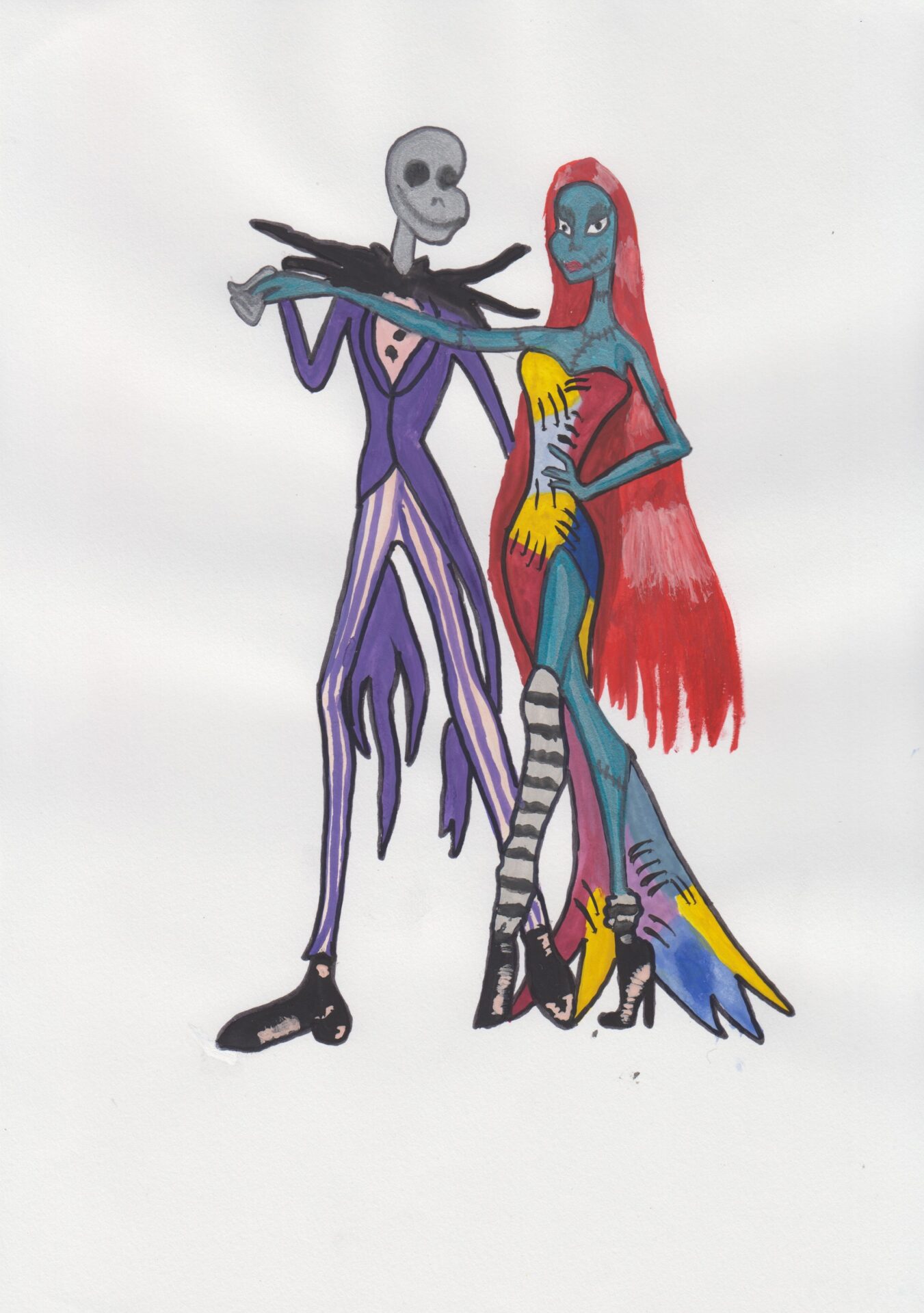 Para młoda w postaci potworów – on kościotróp, ona zszyta przez Frankeinsteina. Namalowani mazakami i farbami na kartce a4.