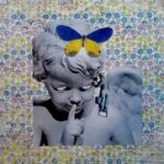 Kolaż inspirowany cytatem M.Ghandi nawiązujący do wydarzeń w Ukrainie. Ręcznie cięty,naklejiny na wzorzysty papier. Oryginał bez ramy.