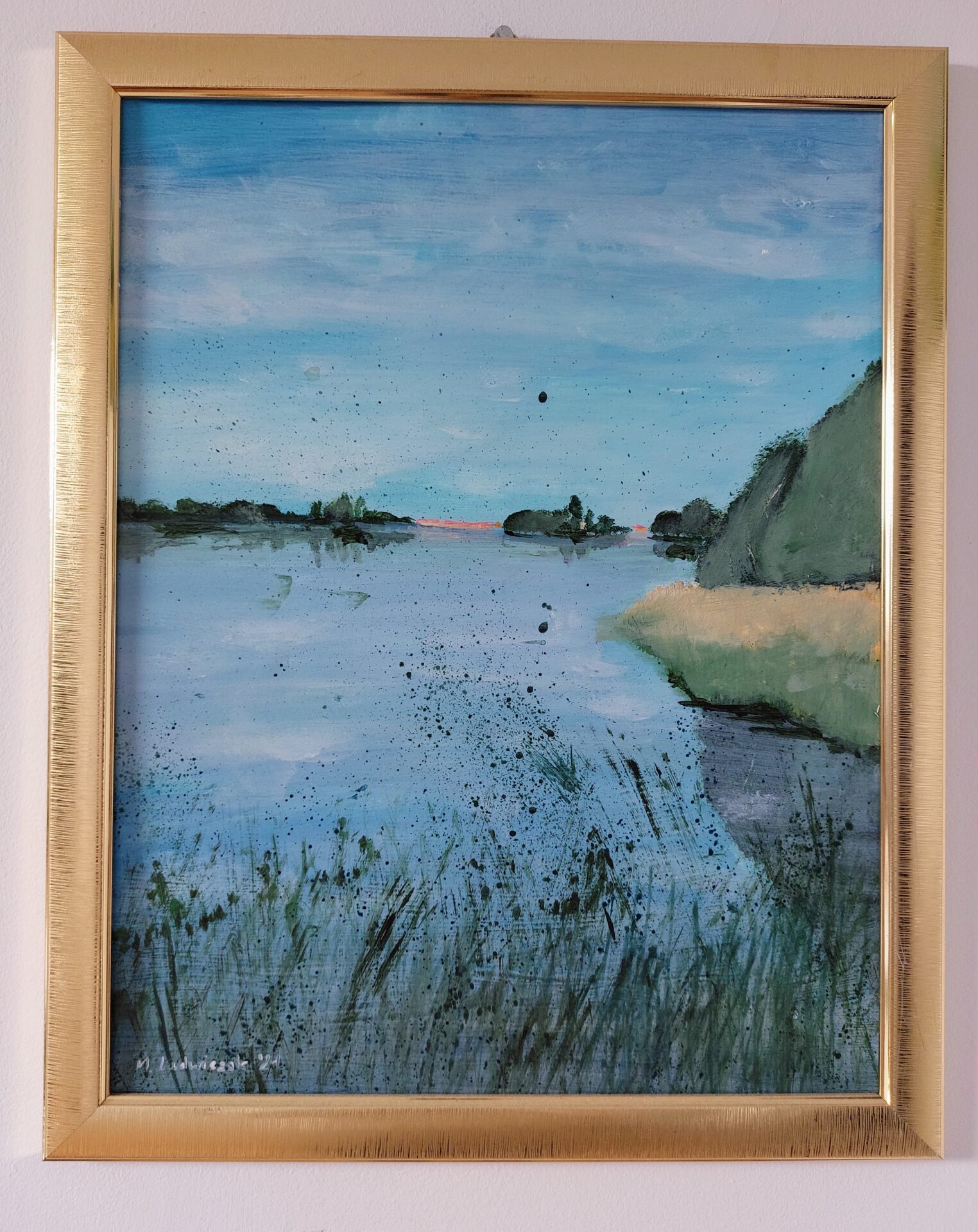Widok miasta z perspektywy jeziora. Delikatny, niemal pastelowy. Oprawiony w złotą, lekką ramę z tworzywa (szer. ramy ok 2,5 cm)