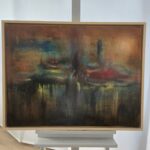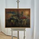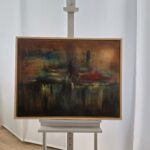 Obraz namalowany techniką akrylową na płótnie, zabezpieczony werniksem, oprawiony w ramę i gotowy do zawieszenia. Przedstawia widok stawu, z odbijajacym sie w wodzie fragmentem brzegu. Utrzymany w ciepłej tonacji, będzie pasował do nowoczesnego oraz klasycznego wnętrza.