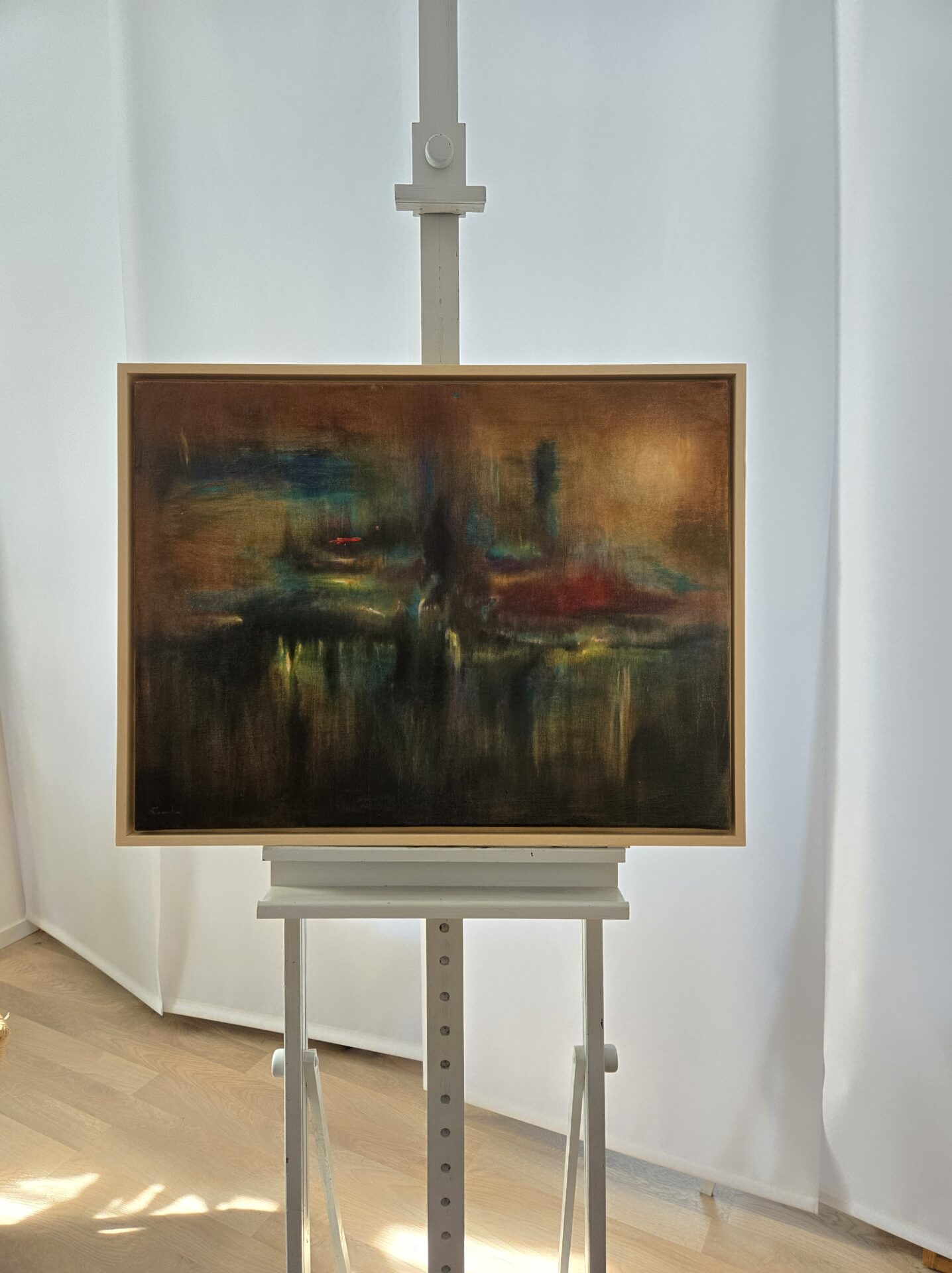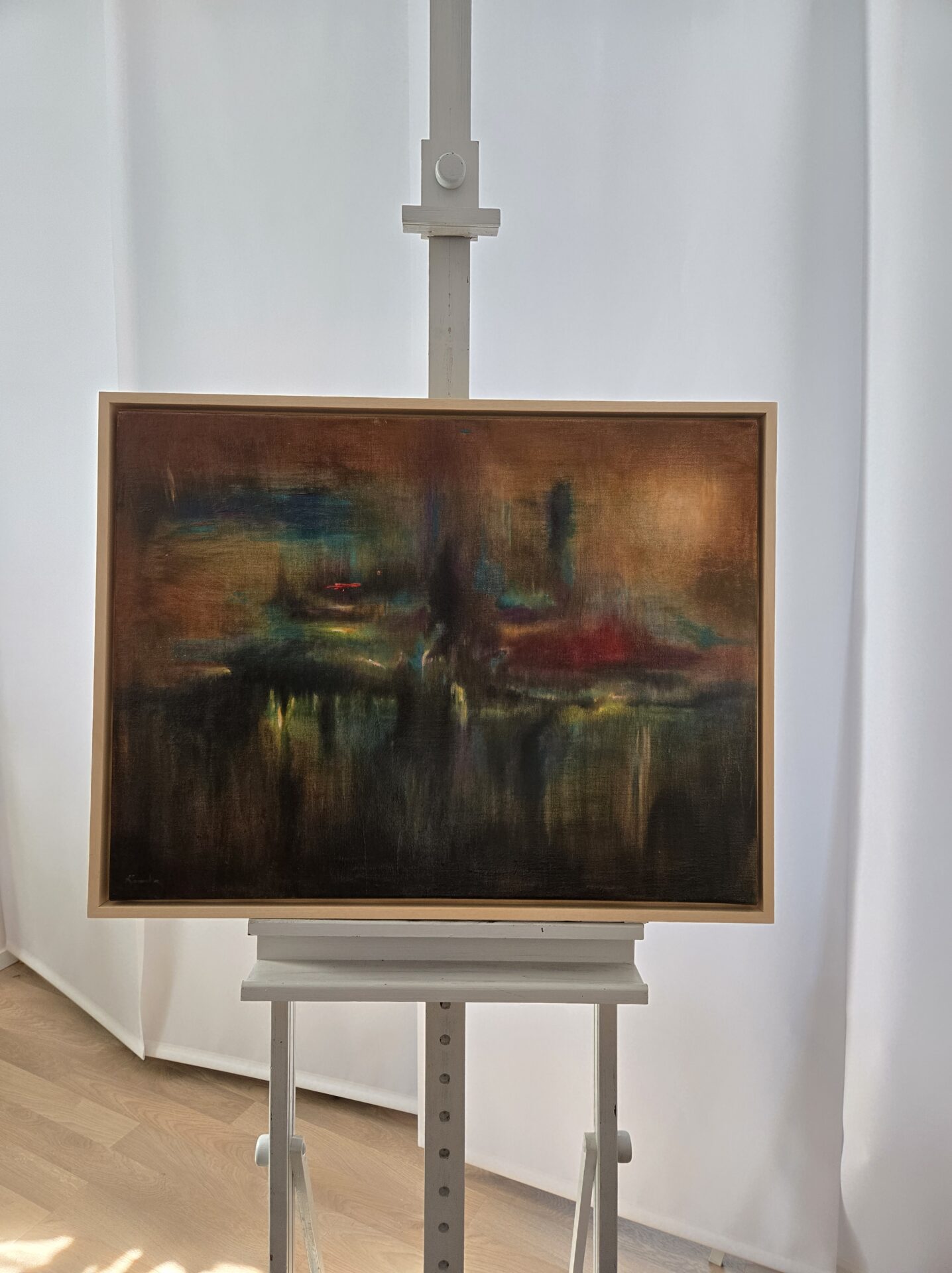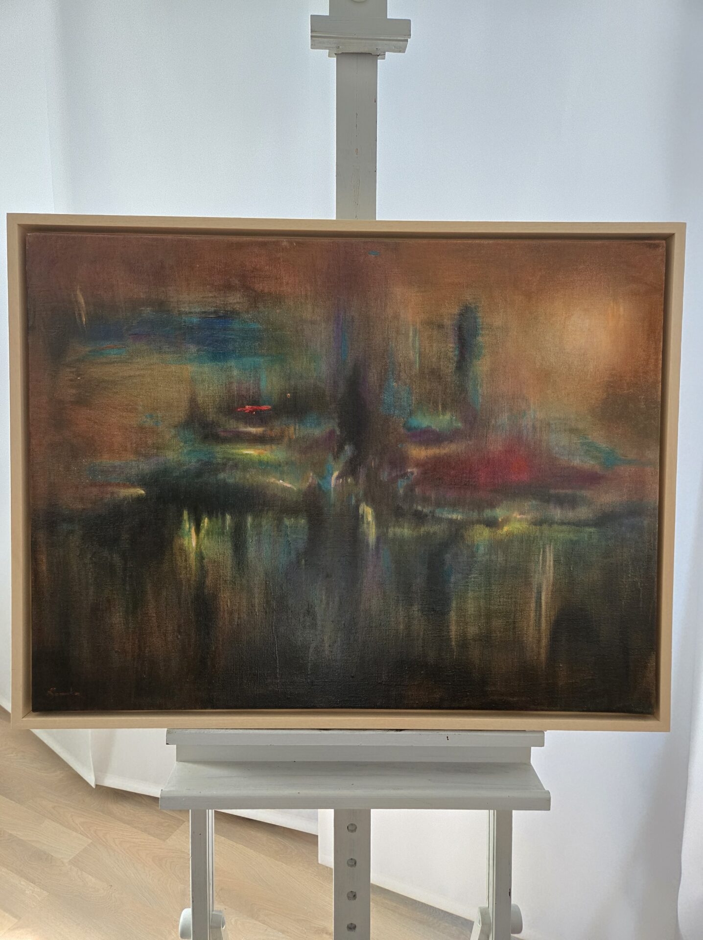 Obraz namalowany techniką akrylową na płótnie, zabezpieczony werniksem, oprawiony w ramę i gotowy do zawieszenia. Przedstawia widok stawu, z odbijajacym sie w wodzie fragmentem brzegu. Utrzymany w ciepłej tonacji, będzie pasował do nowoczesnego oraz klasycznego wnętrza.