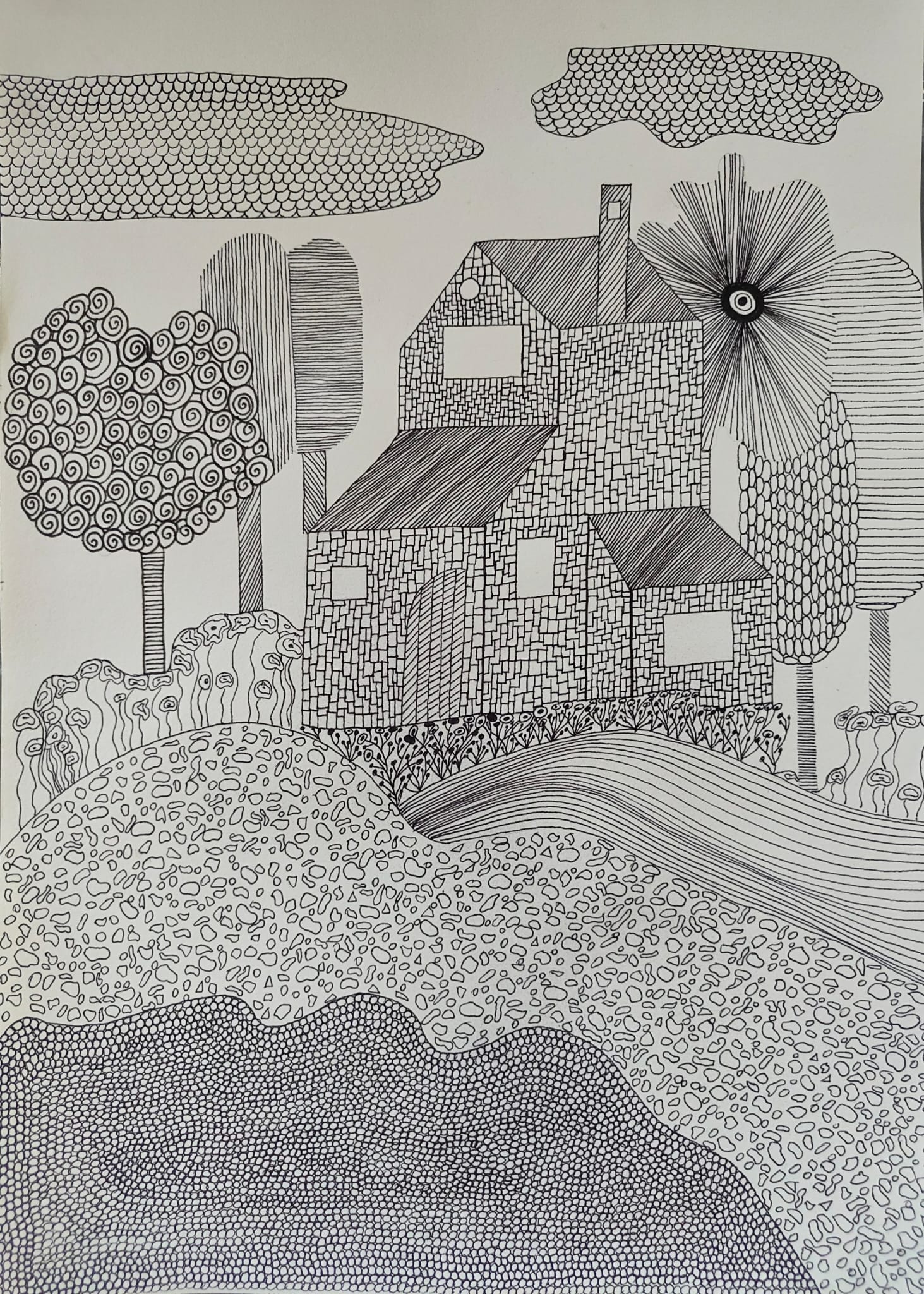 Grafika ręcznie wykonana czarnym cienkim cienkopisem. Format a3, papier koloru ivory. Zainteresowanym prześlę fotki jak powstawał.