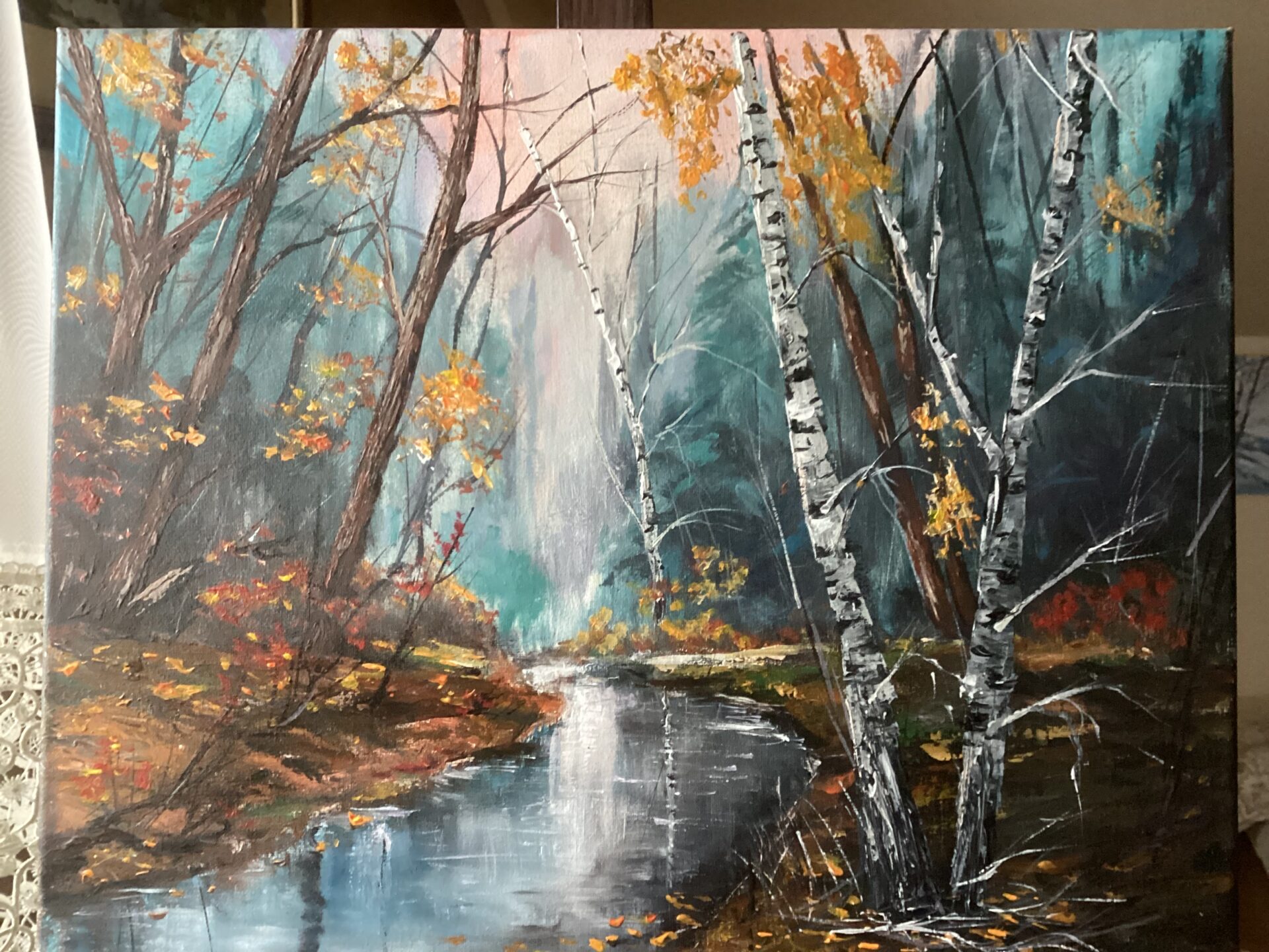 Jesienny ,mglisty poranek na malowany szpachlą na wysokiej jakości płótnie bawełnianym . Zastosowany jako wykończenie werniks satynowy zabezpiecza kolory przed wyblaknięciem. Nie wymaga oprawy , boki kolorystycznie są kontynuacją obrazu. Z tylu zawieszka .