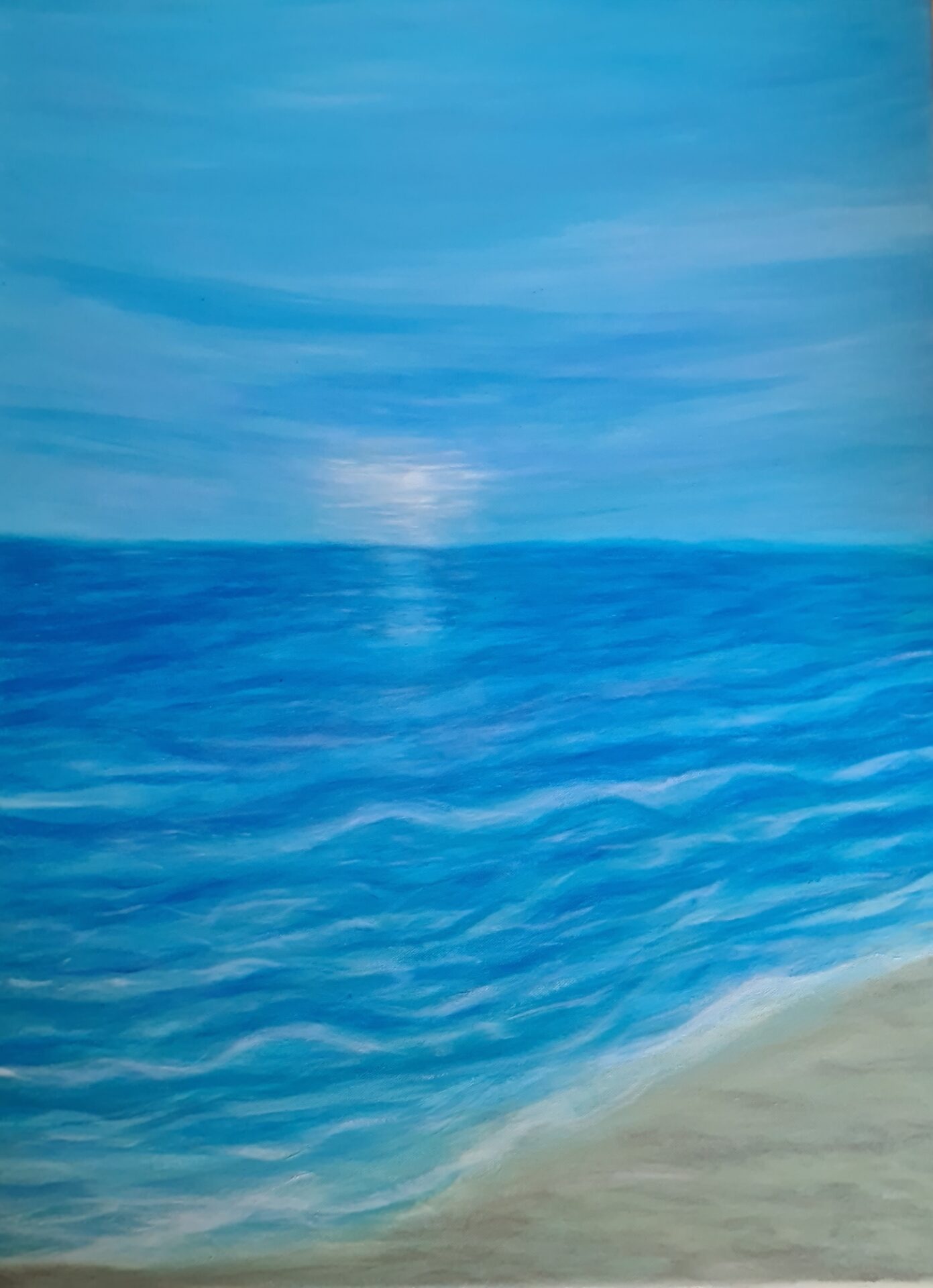 Obraz przedstawiający pejzaż morski w kolorach błękitu. Namalowany farbami akrylowymi na płótnie bawełnianym o wymiarach 60/80 cm