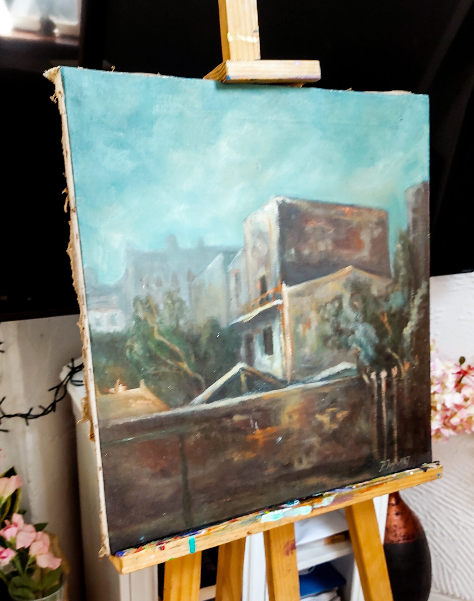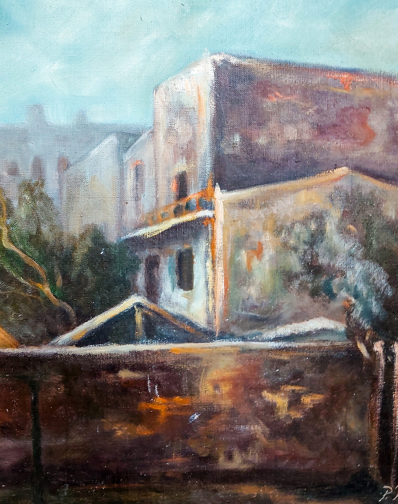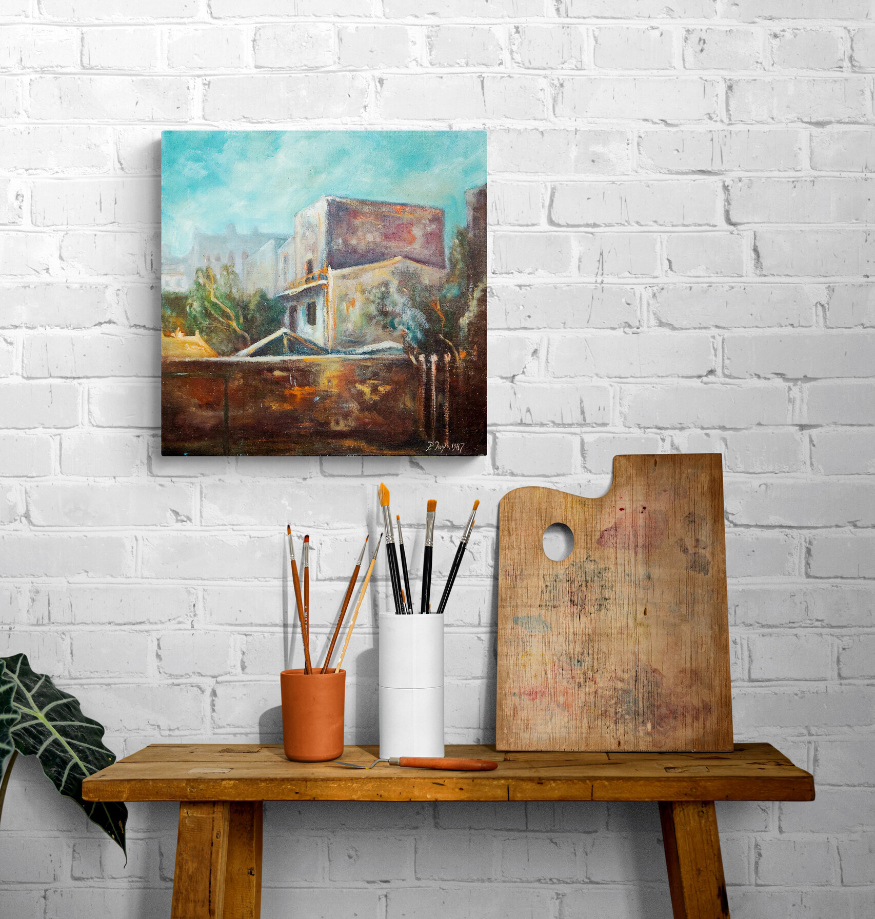 Praca na płótnie lnianym wykonana farbami olejnymi w 1987r Autorska praca Paweł Jagła werniksowana.Wymiar: szer. 44,5 cm x 47 cm wysokość.