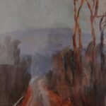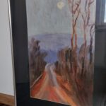 Wyjątkowy pejzaż z droga widzianą z góry, z polskich podkgórskich regionów. Metoda malarska: farny olejne na zagruntowanym kartonie, w antyramie szklano-aluminiowej srebrnej 50/70 cm. Praca została zbezpieczona werniksem