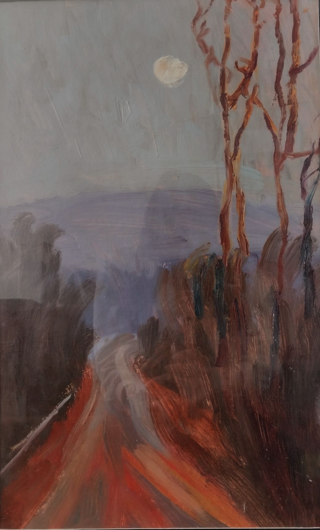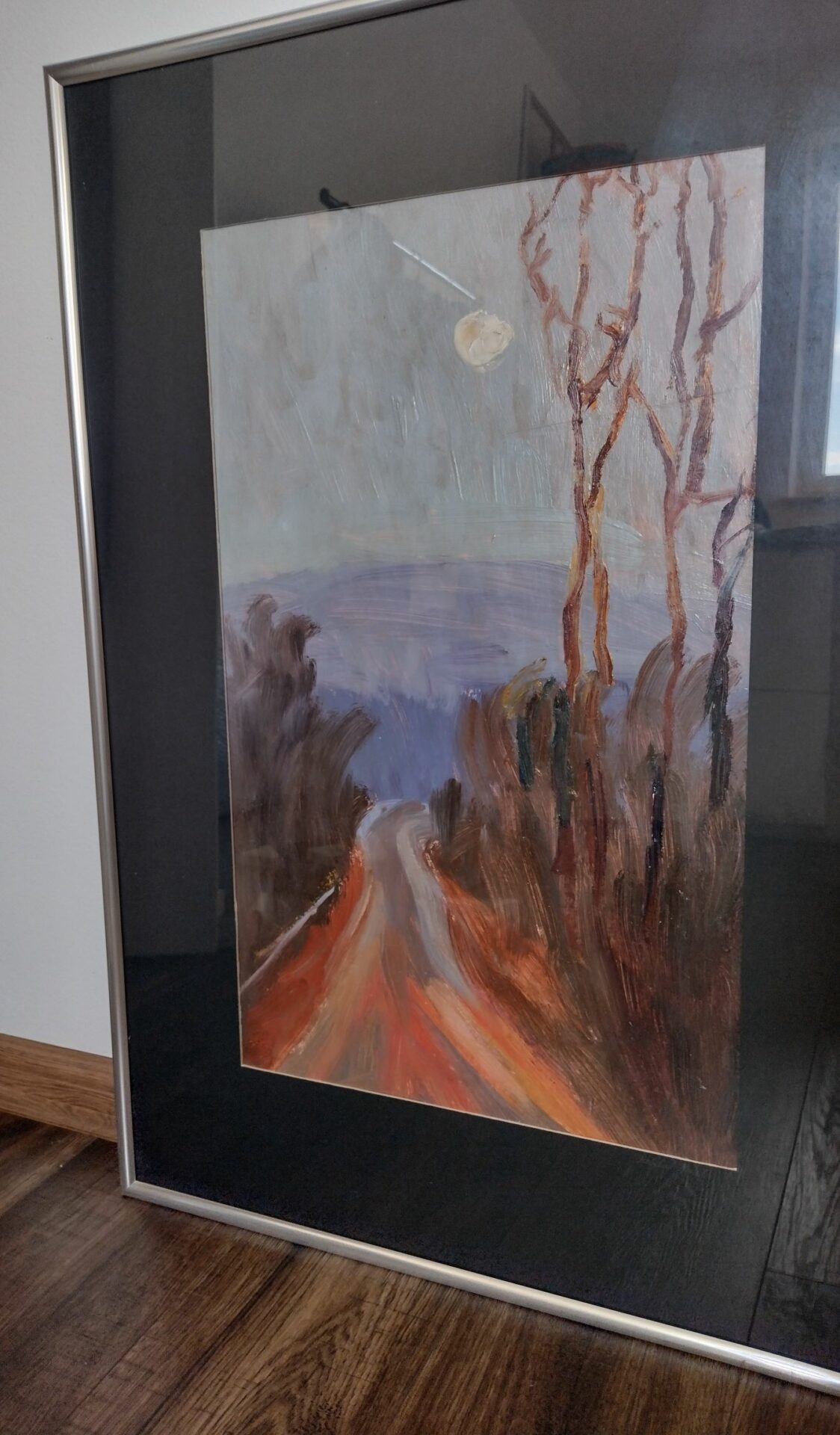Wyjątkowy pejzaż z droga widzianą z góry, z polskich podkgórskich regionów. Metoda malarska: farny olejne na zagruntowanym kartonie, w antyramie szklano-aluminiowej srebrnej 50/70 cm. Praca została zbezpieczona werniksem