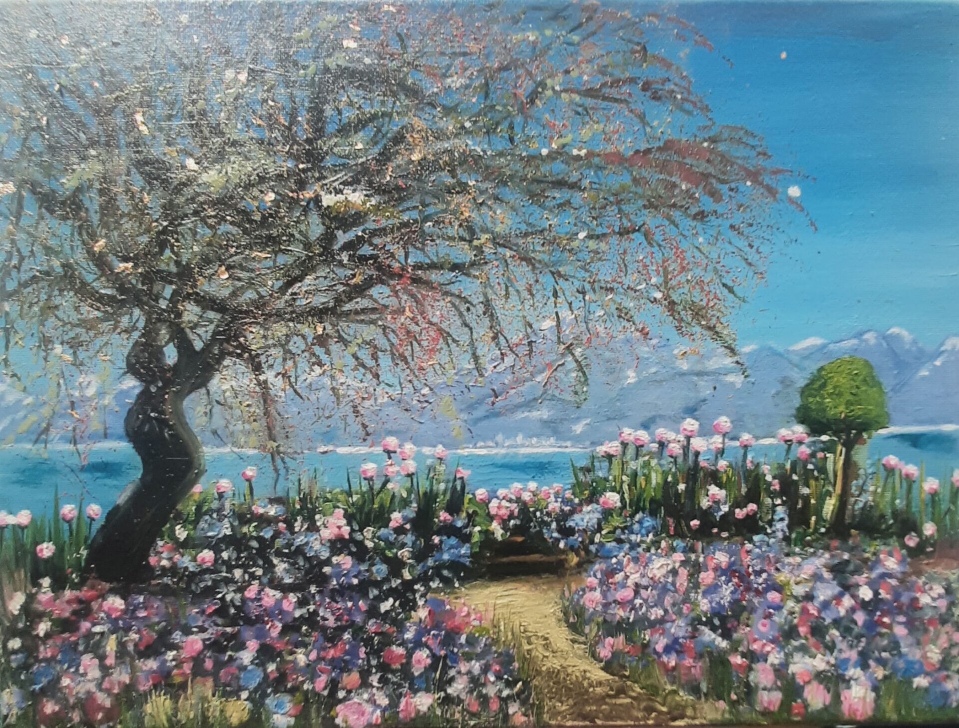 - Akryl na płótnie, dodatkowo użyłam trochę szlagmetalu. Pejzaż zachwycił mnie podczas podróży przez Szwajcarię. Uwieczniłam go na zdjęciu a potem już w pracowni powstał o raz.