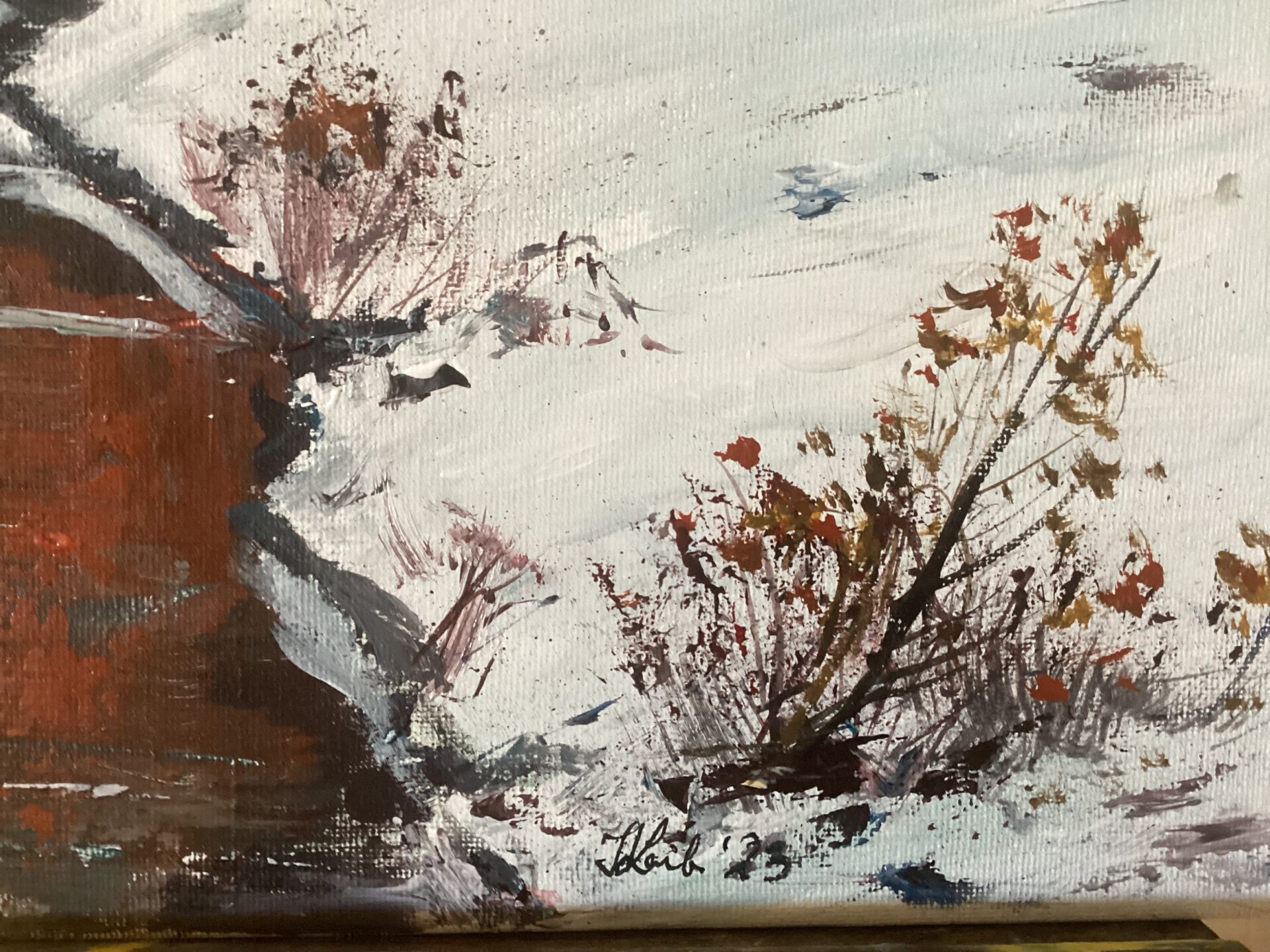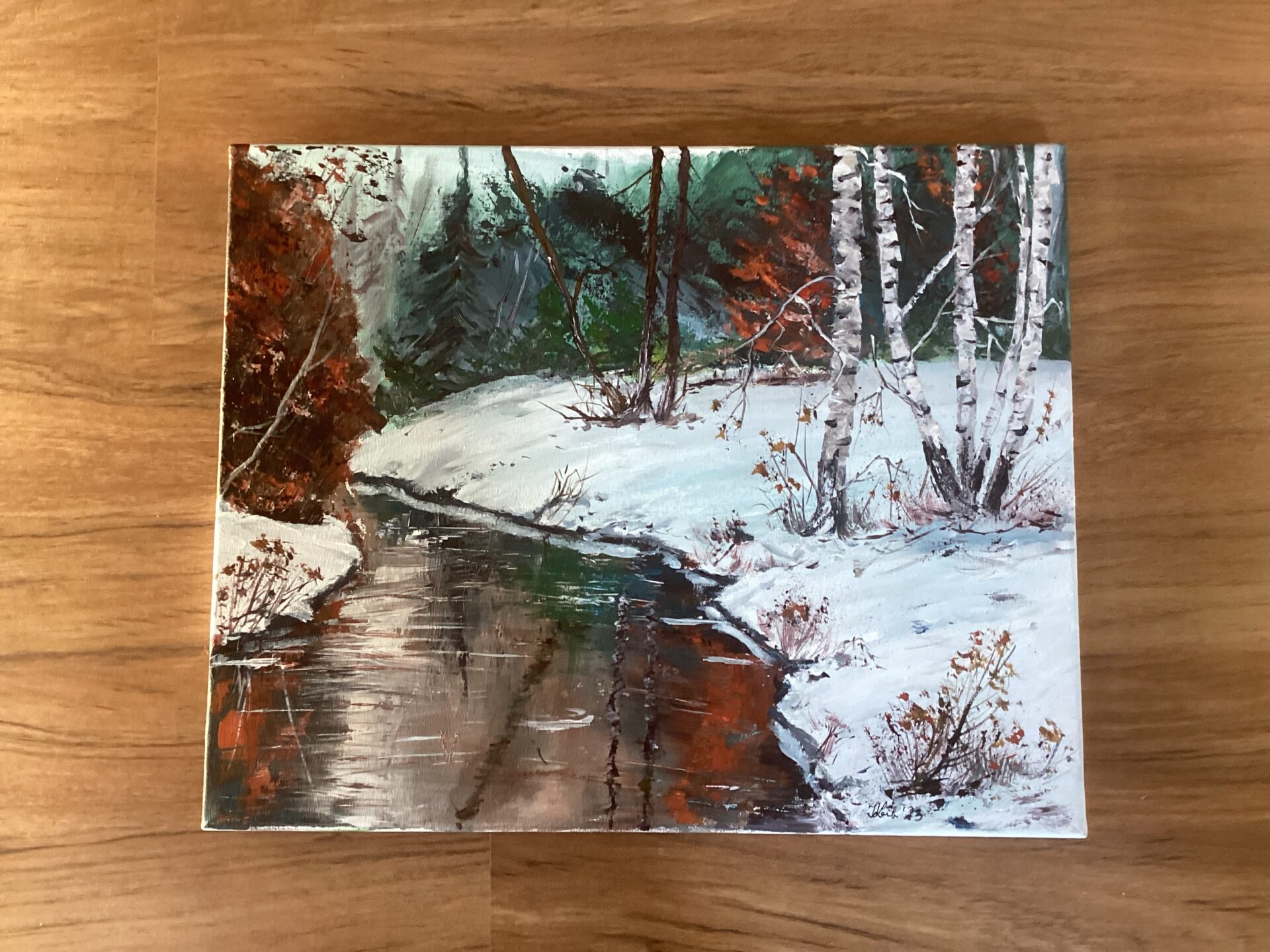 Okolice rzeczki Skoryń w zimowej odsłonie. Akryl i szpachla , położone na płótnie polskiego producenta. Warstwa werniksu satynowego stanowi wykończenie pracy, zabezpieczając farby przed utratą kolorów na długie lata. Praca sygnowana.Kwestie wysyłki do ustalenia . Możliwy odbiór osobisty. Zapraszam do kontaktu.