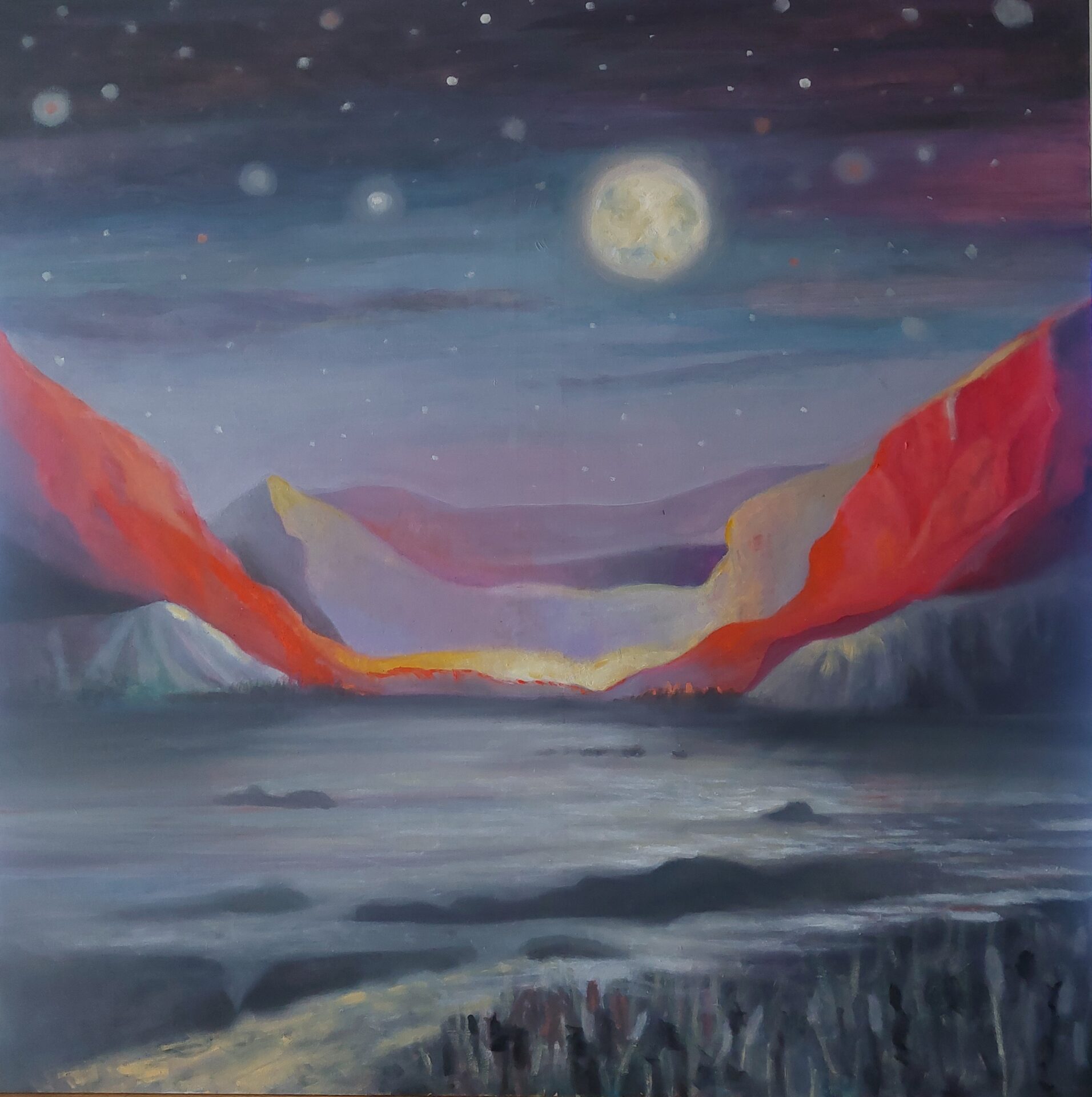 Obraz przedstawia pełnię księżyca. Jest magiczny, surrealistyczny. Pelnia to magiczny moment który chciałam pokazać na obrazie.