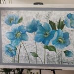 Przedstawiam nowoczesny, abstrakcyjny obraz mojego autorstwa pt.: ” Perłowe kwiaty”, namalowany profesjonalnymi farbami akrylowymi o perłowym, metalicznym połysku firm: DecoArt oraz Liquitex, na podobraziu bawełnianym pokrytym grubym włoskim płótnem o doskonałej jakości. Obraz zawiera namalowane obramowanie w kolorze białej perły oraz szarości i dodatkowo ozdobione zostało srebrną linią. Dzięki temu można go powiesić na ścianie bez potrzeby zakupu ramy. Kwiaty mają metaliczno – perłowy połysk, który uwidacznia się pod kątem padania światła. Całość jest delikatna i zarazem elegancka. Podpis autora znajduje się na awersie i rewersie. Wymiary 60 x 80 cm (szerokość blejtramy : 2 cm). Obraz został wykończony werniksem z połyskiem. Obraz wysyłam za pośrednictwem Poczty Polskiej jako przesyłkę wraz z ubezpieczeniem. Istnieje również możliwość osobistego odbioru.