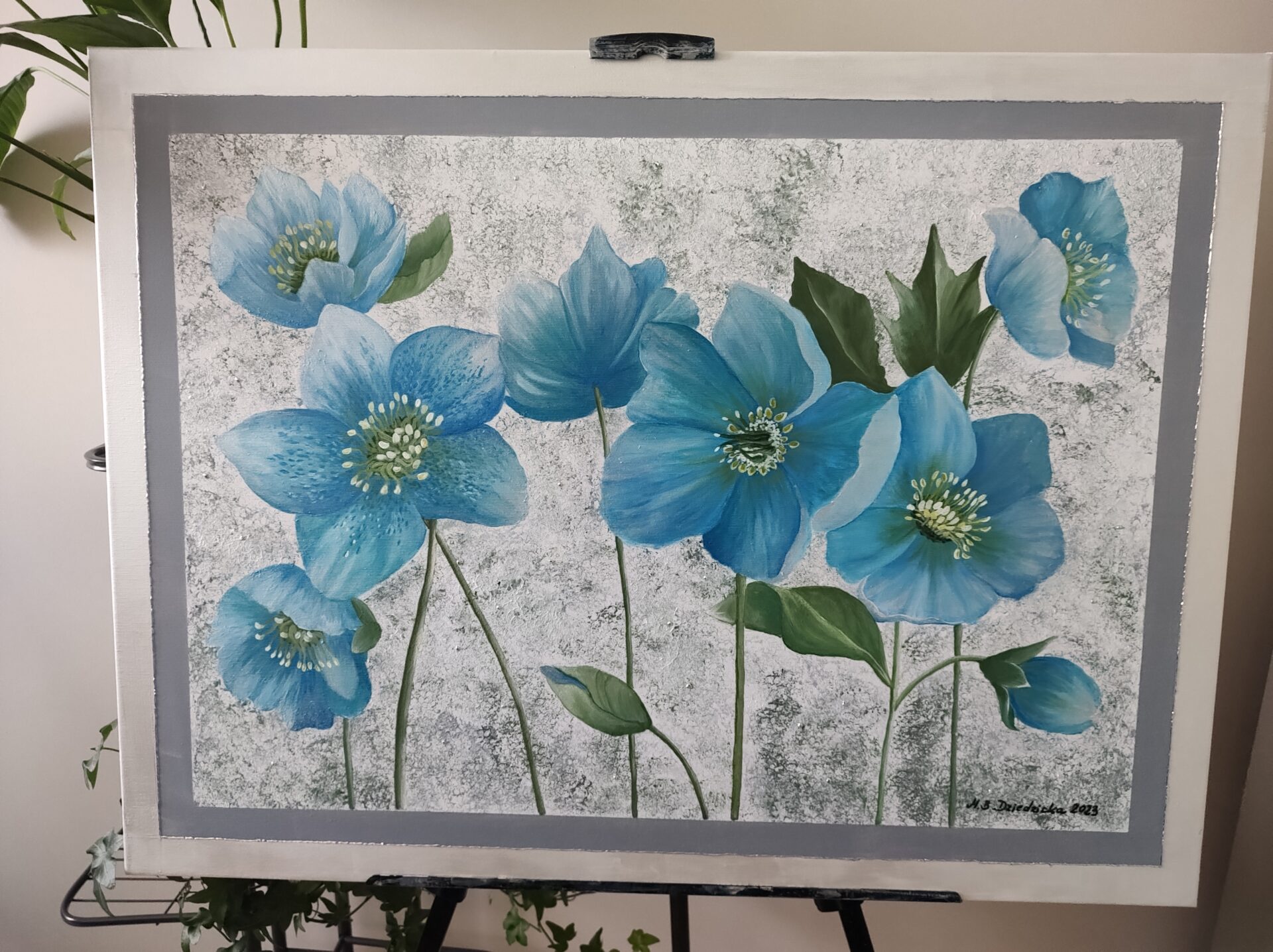 Przedstawiam nowoczesny, abstrakcyjny obraz mojego autorstwa pt.: ” Perłowe kwiaty”, namalowany profesjonalnymi farbami akrylowymi o perłowym, metalicznym połysku firm: DecoArt oraz Liquitex, na podobraziu bawełnianym pokrytym grubym włoskim płótnem o doskonałej jakości. Obraz zawiera namalowane obramowanie w kolorze białej perły oraz szarości i dodatkowo ozdobione zostało srebrną linią. Dzięki temu można go powiesić na ścianie bez potrzeby zakupu ramy. Kwiaty mają metaliczno – perłowy połysk, który uwidacznia się pod kątem padania światła. Całość jest delikatna i zarazem elegancka. Podpis autora znajduje się na awersie i rewersie. Wymiary 60 x 80 cm (szerokość blejtramy : 2 cm). Obraz został wykończony werniksem z połyskiem. Obraz wysyłam za pośrednictwem Poczty Polskiej jako przesyłkę wraz z ubezpieczeniem. Istnieje również możliwość osobistego odbioru.