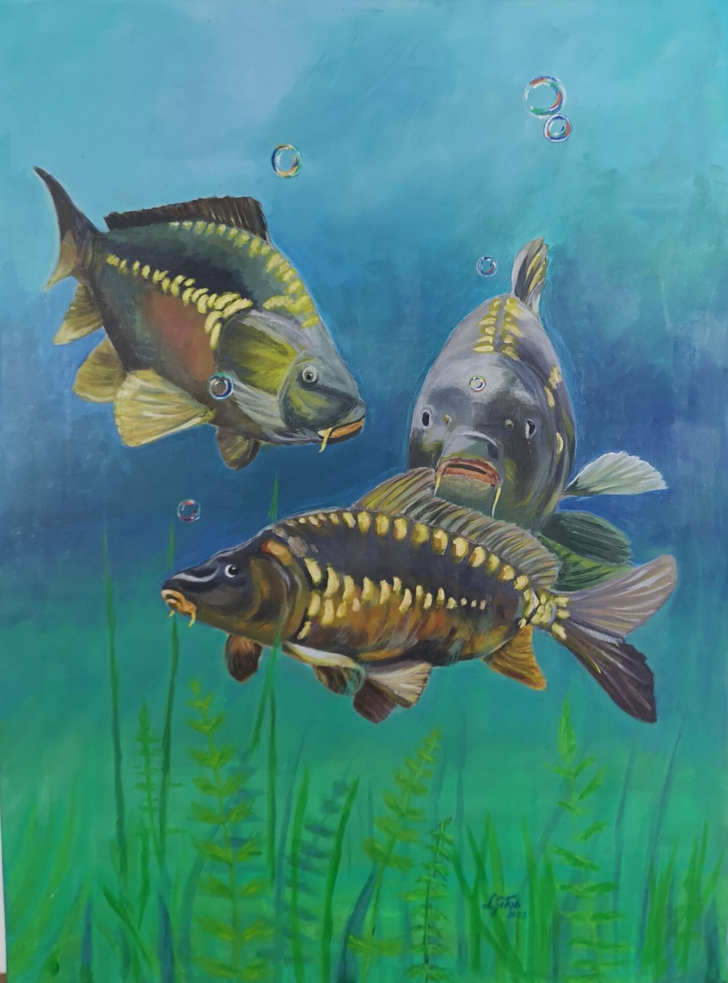 Karpie w spokojnej wodzie jeziora. Obraz będzie pasował na przykład do restauracji rybnej lub będzie prezentem dla miłośnika wędkarstwa i nie tylko.