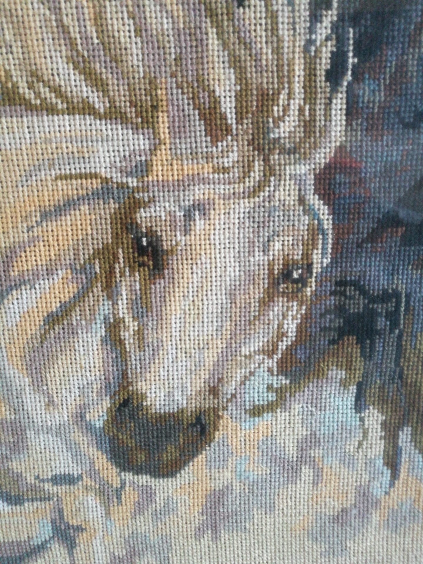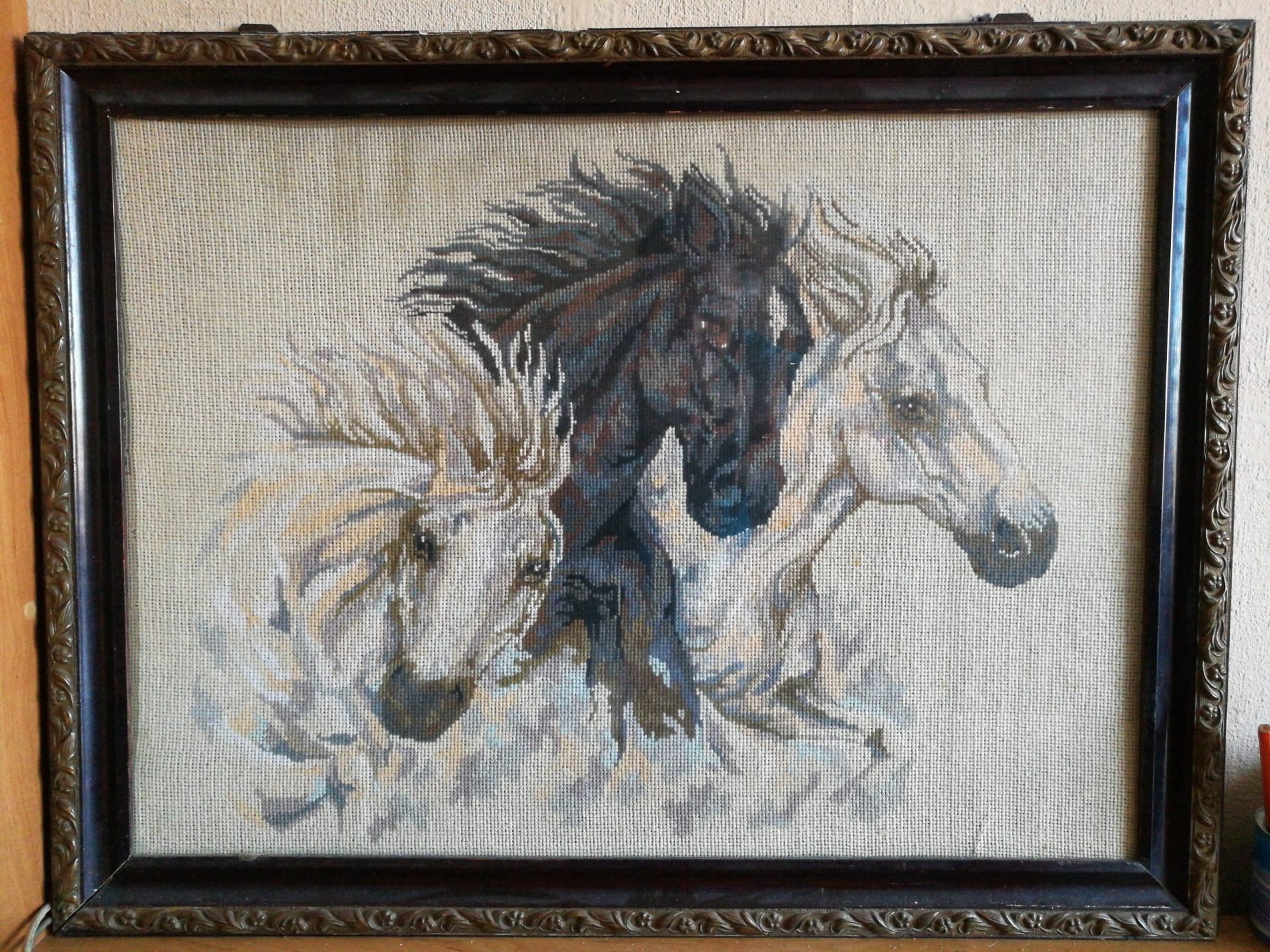 Cudowne galopujące konie wykonane techniką haftu krzyżykowego. Haft na calej powierzchni obrazu. Wymiar bez ramy 63×47. Rama do renowacji lub wymiany. W razie zainteresowania proszę o kontakt email (Annagurel2018@gmail.com). Pozdrawiam Panstwa serdecznie.