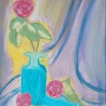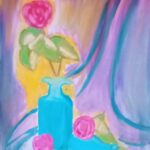 Sprzedam Obraz przedstawiający piękne różowe róże w niebieskim wazonie na fioletowym tle.