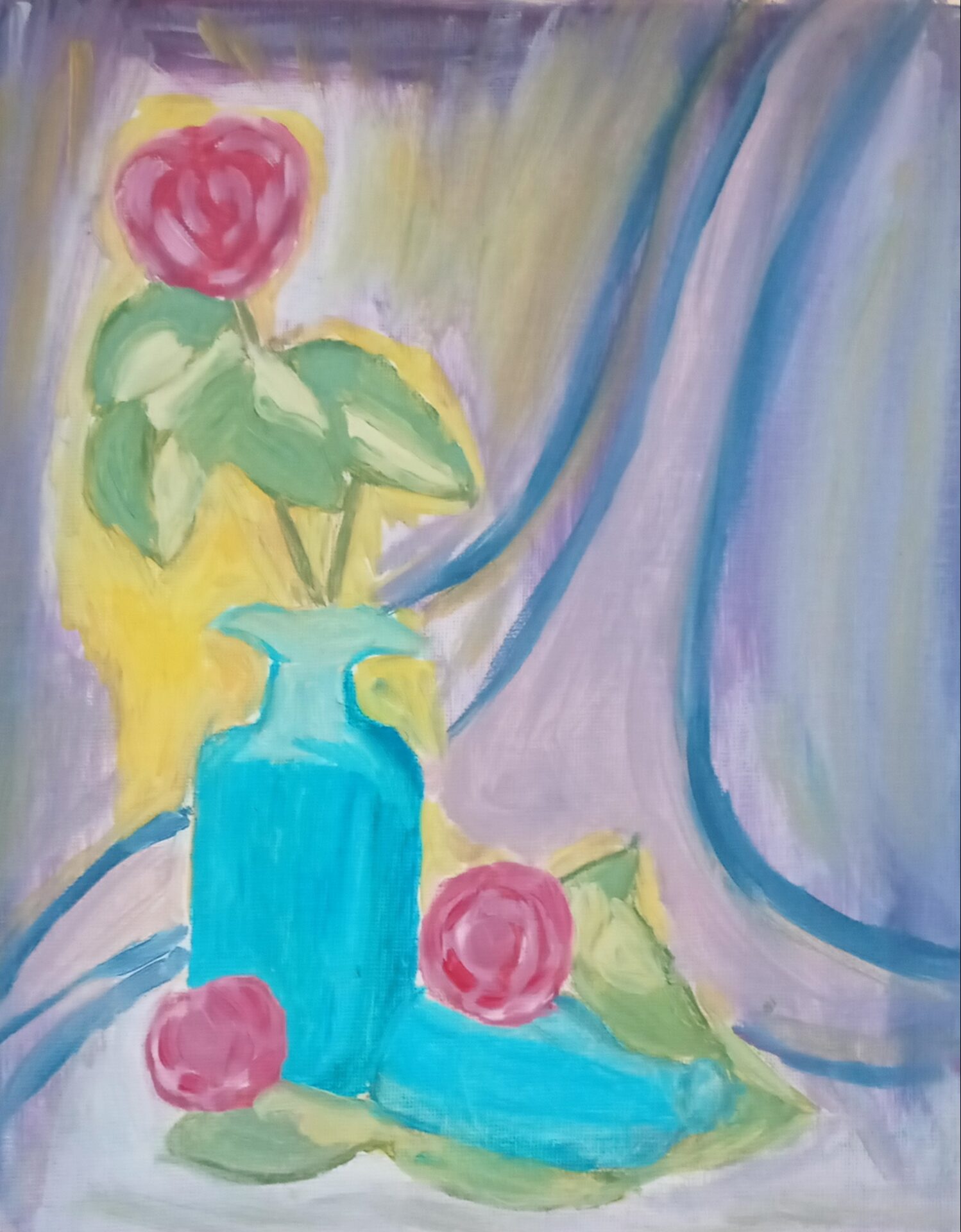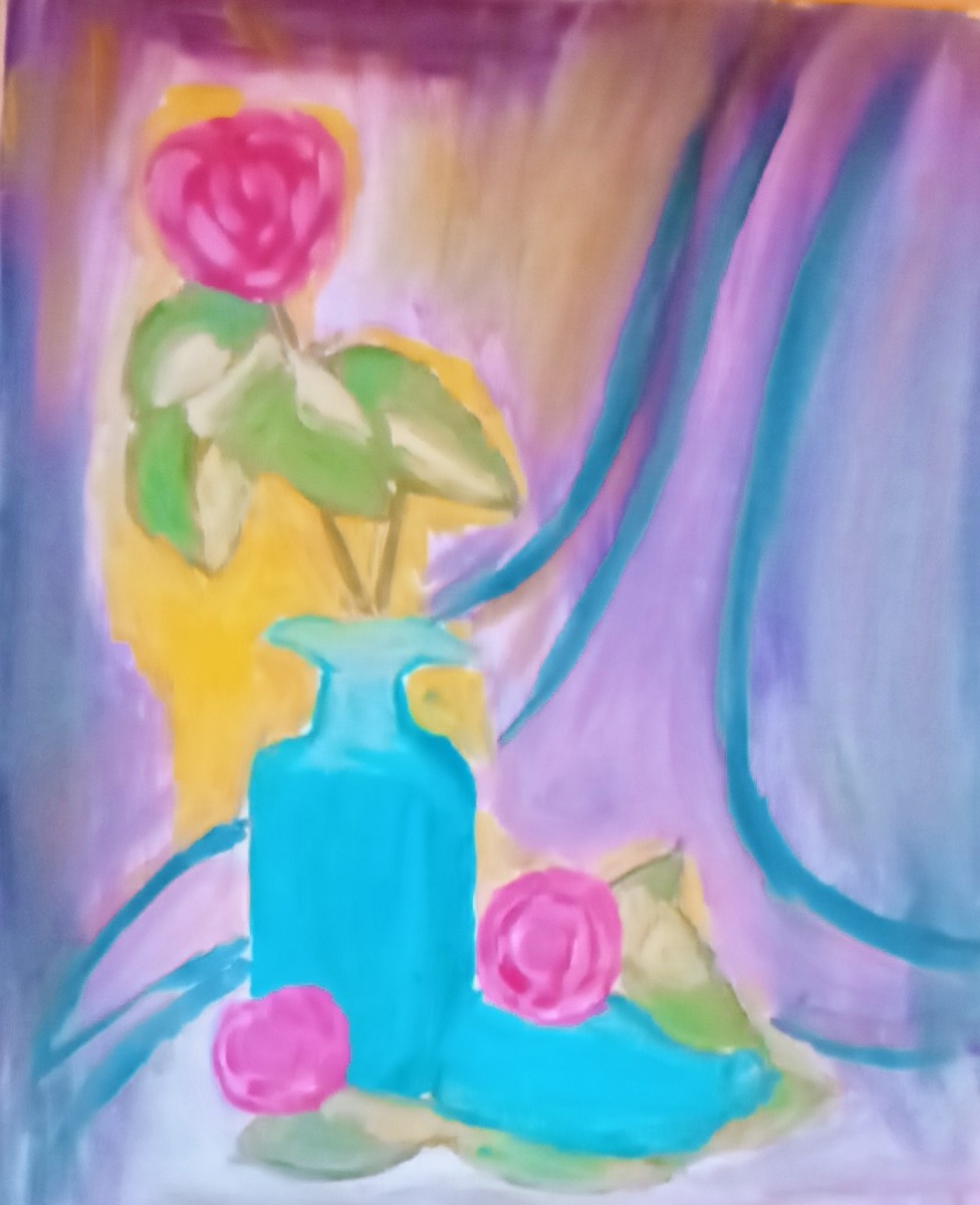 Sprzedam Obraz przedstawiający piękne różowe róże w niebieskim wazonie na fioletowym tle.