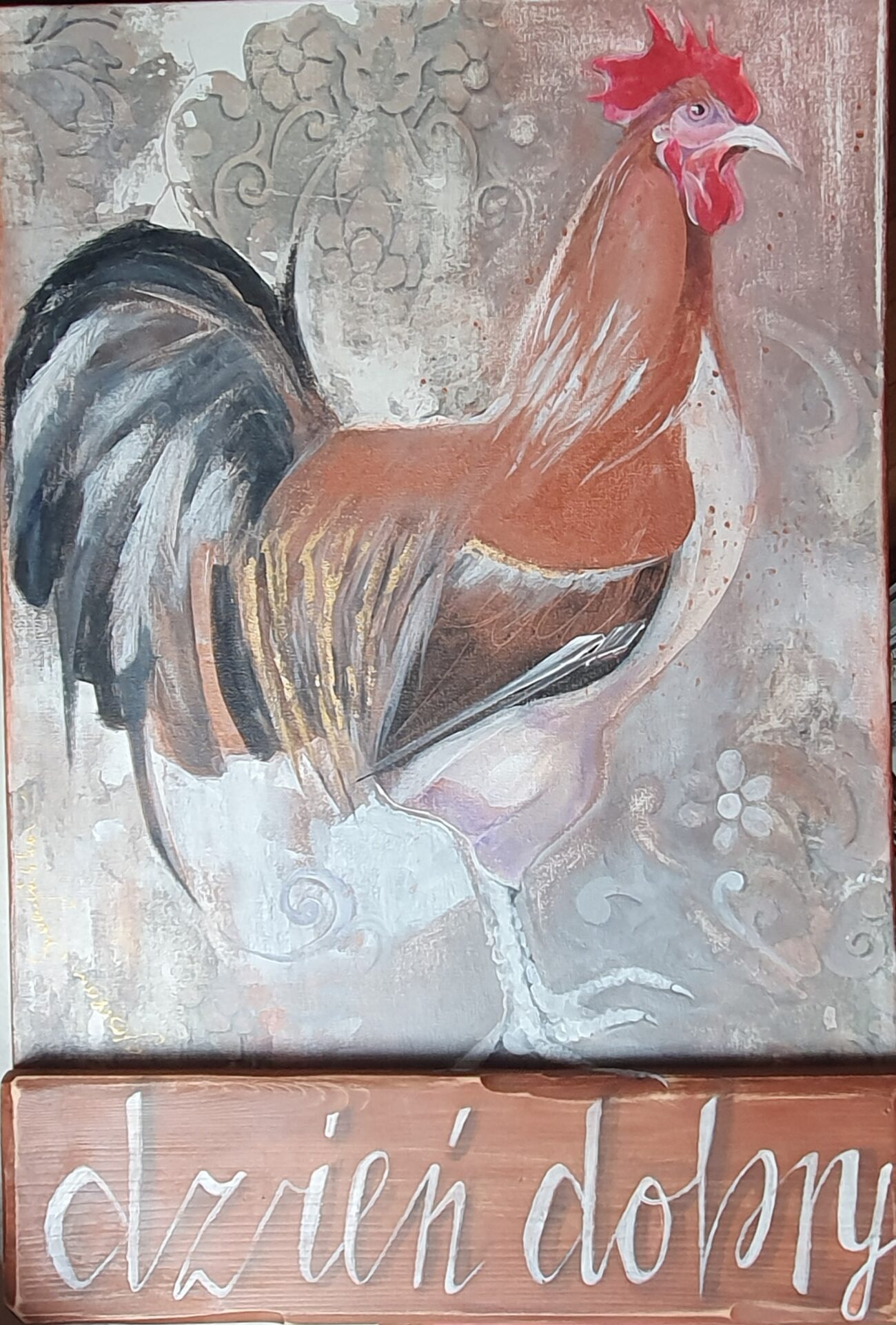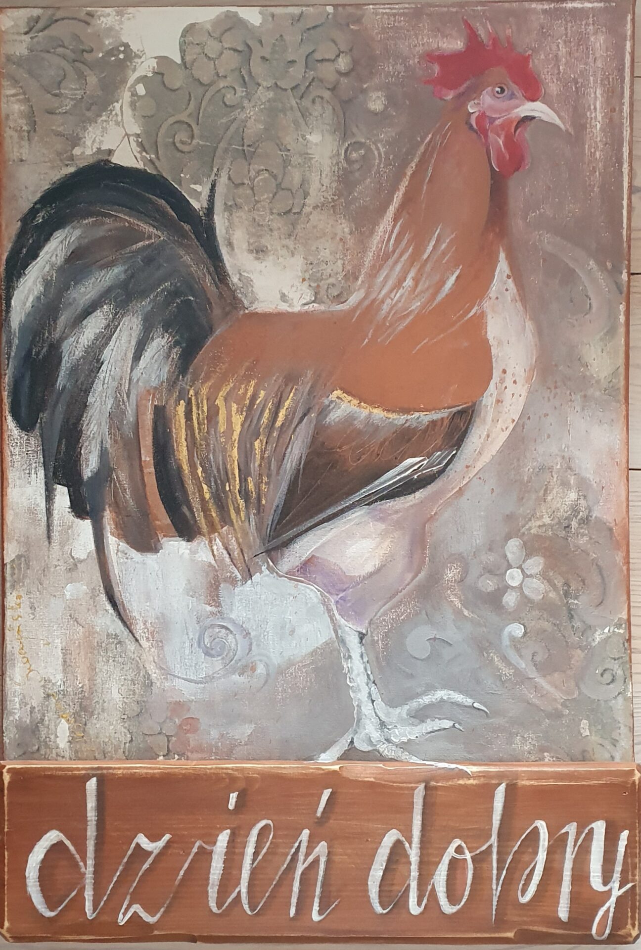 Obrazek dekoracyjny, technika mieszana: akryl, transfer, złotko, zamiast zwykłej ramy stara deseczka z napisem.