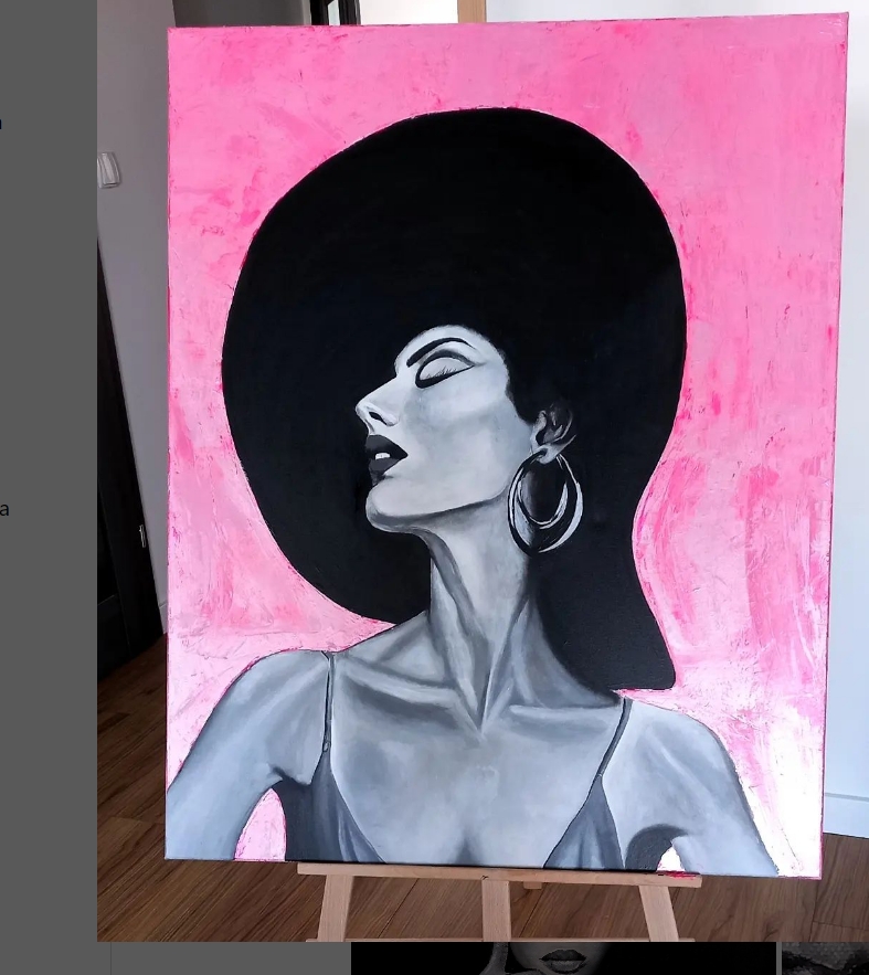 Obraz ręcznie malowany farbami akrylowymi na płótnie. Kolorystyka czerń,biel,róż. Boki obrazu zamalowane