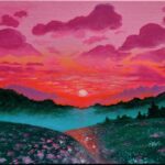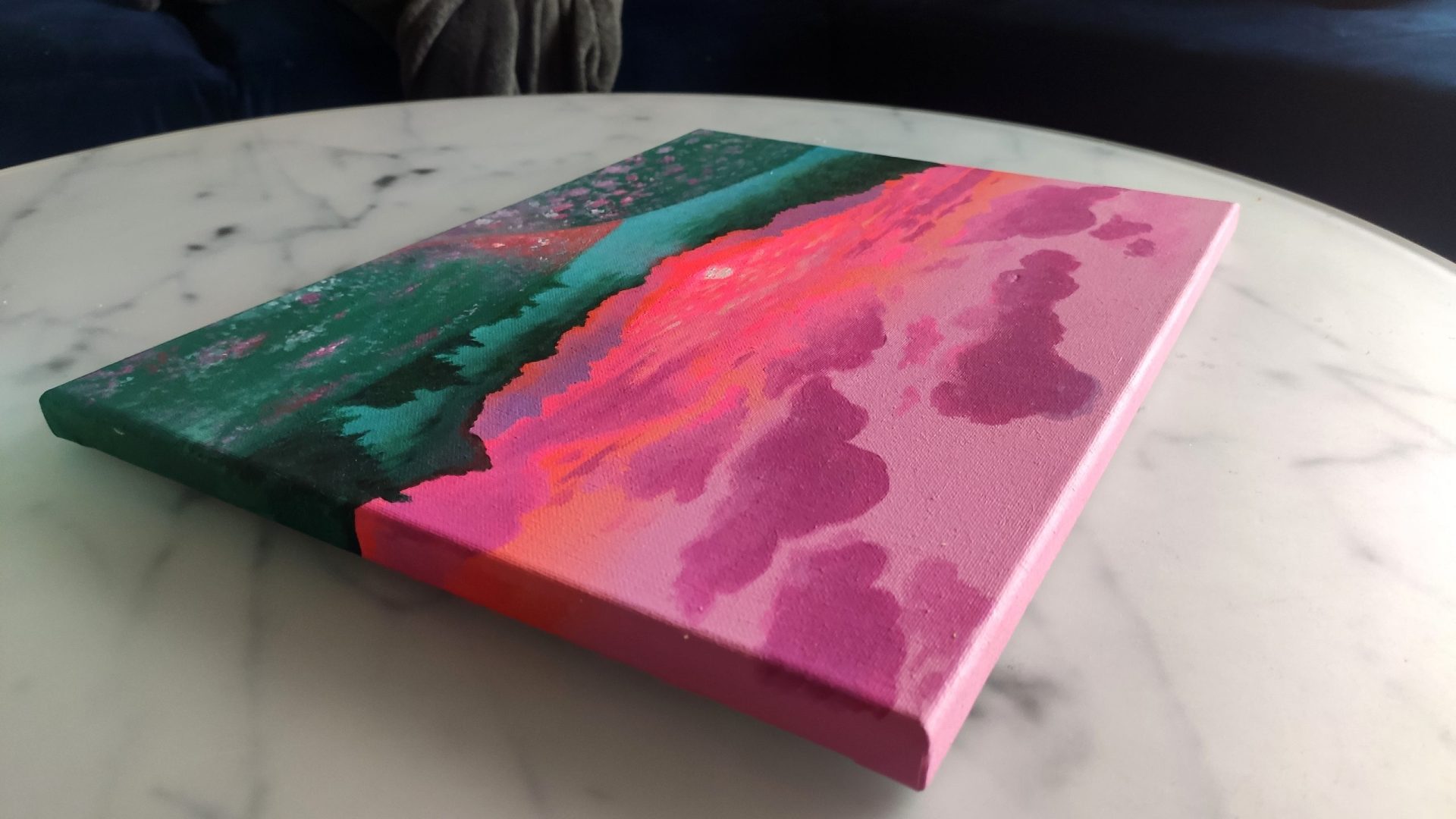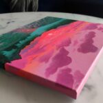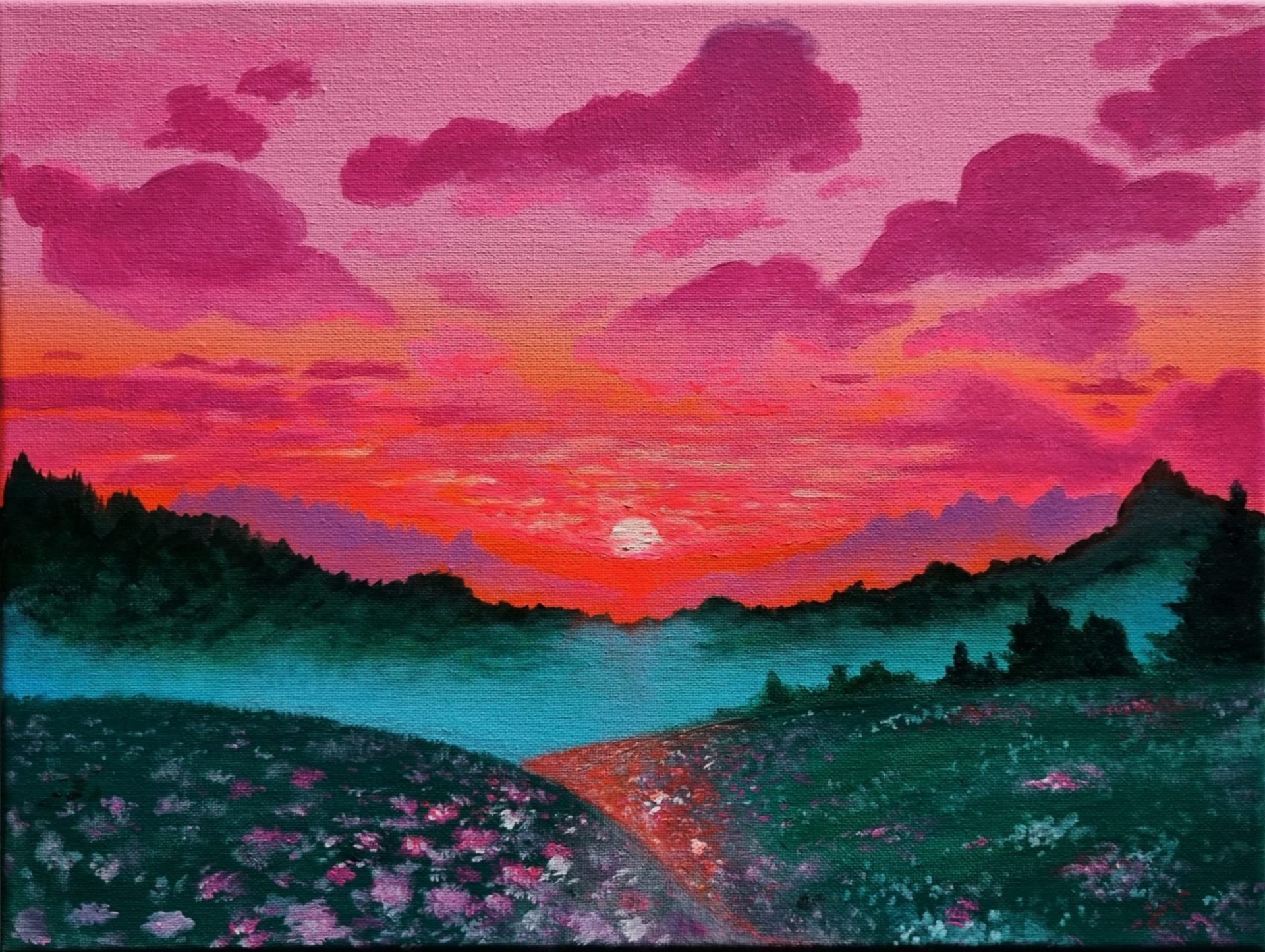 Akryl na płótnie. Do podkreślenia barw zachodzącego słońca użyłam neonowych farb akrylowych, tak żeby obraz wydawał sie żywym odzwierciedleniem nieba.