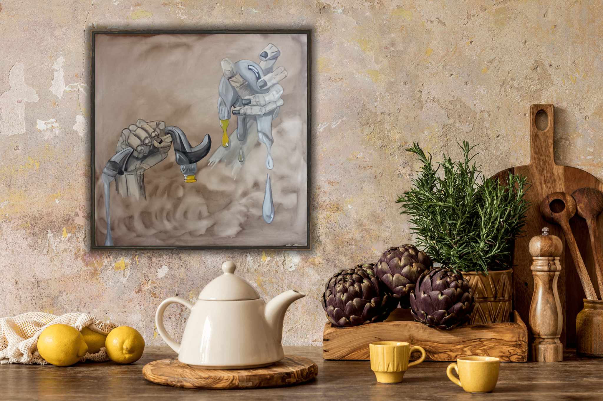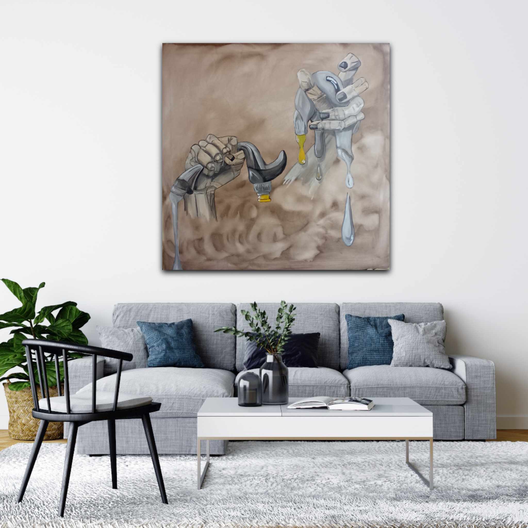 Każdy mój obraz ma unikalną, niepowtarzalną tematykę i jest jedyny w swoim rodzaju. Obraz w nurcie surrealizmu/symbolizmu. Pasuje do wnętrz nowoczesnych oraz typu loft. Kolorystyka stonowana, odcienie, brązów, żółtego.