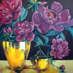 Rok powstania 2022.Wymiary 50 x 60 cm.Obraz pokryty werniksem co zabezpiecza go przed zniszczeniem, tj. kurzem i innymi zjawiskami atmosferycznymi, Obraz jest ręcznie malowany farbami olejnymi najlepszej jakości firmy Rembrandt Sygnowany z przodu jak i na tylnej części płótna.Autor: Teresa Kopańska – artysta malarz. Obraz cechuje się świetlistością kolorów i autycznością złocenia wazonów co zapewne nada charakteru i ożywi każde pomieszczenie.Obraz nie posiada ram co nie przeszkadza zawieszeniu go na ścianie ponieważ ma zamalowane boki w kolorach całości obrazu.