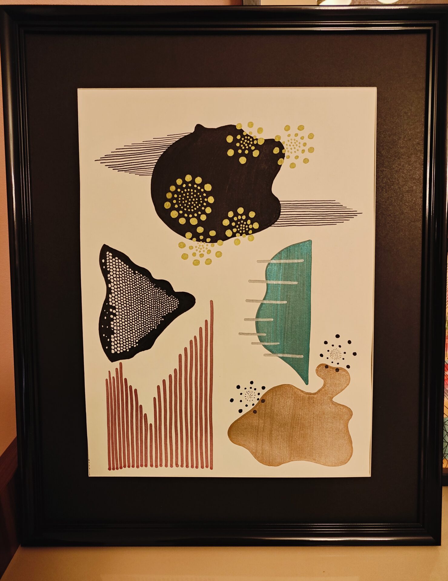 Obraz ręcznie rysowany czarnymi i kolorowymi cienkopisami różnej grubości. Cienkopisy metaliczne i matowe, wodoodporne. Format A3. Rama czarna wymiary 54×43 cm.