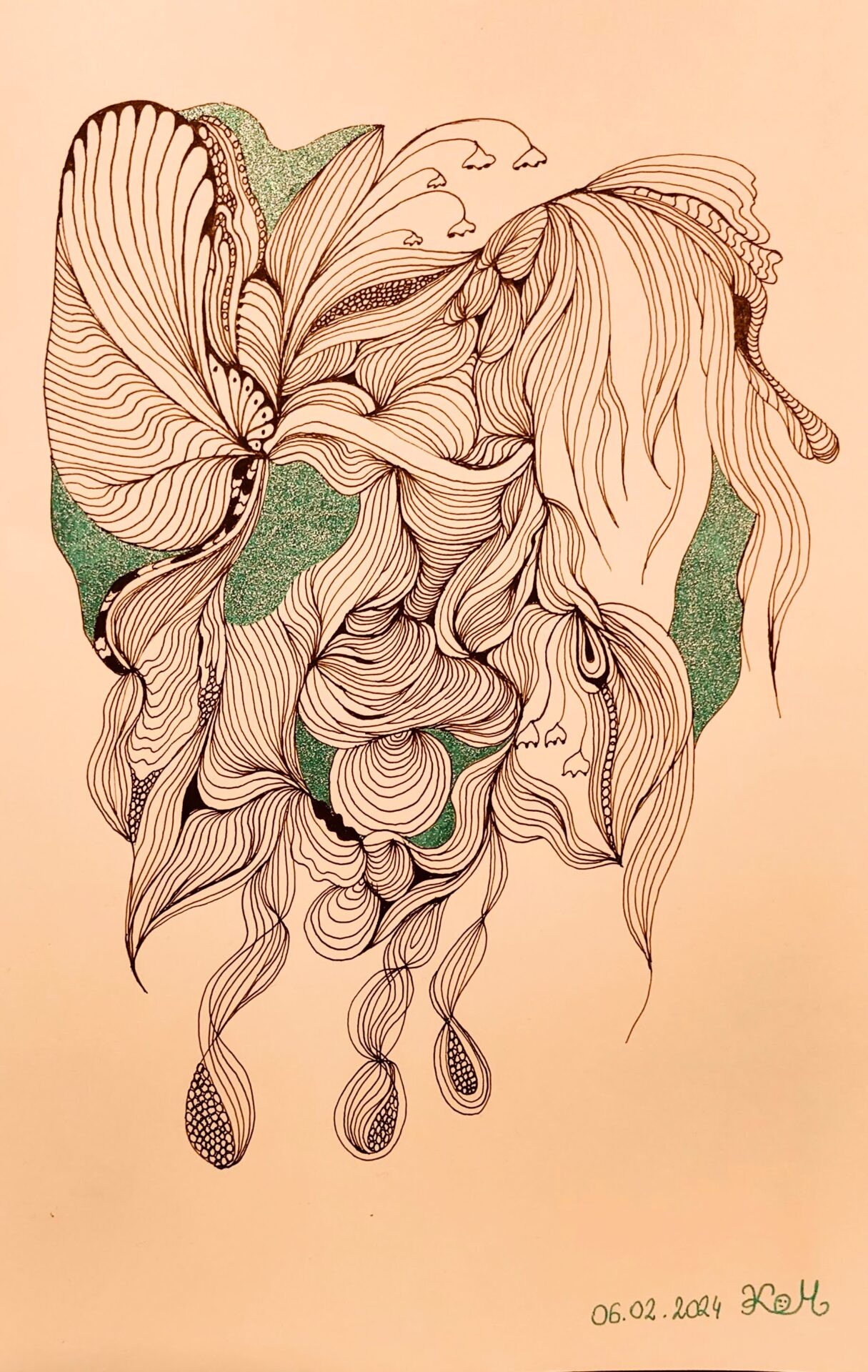 Rysunek wykonany czarnym i zielono-brokatowym cienkopisem. Format a4. Papier kolor ivory. Mogę oprawić w ramę na życzenie +10 zl. Polecam inne moje prace