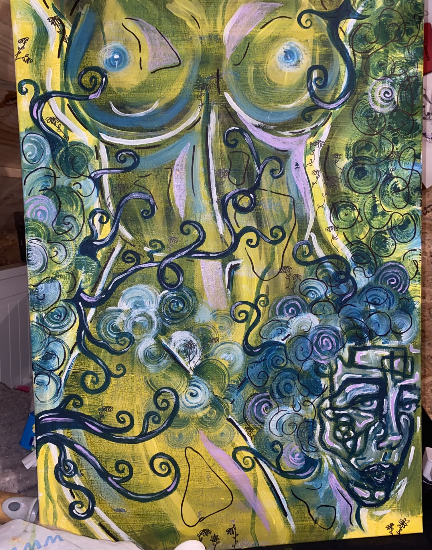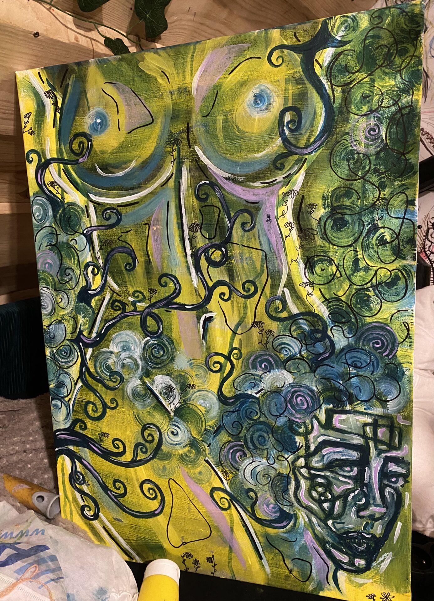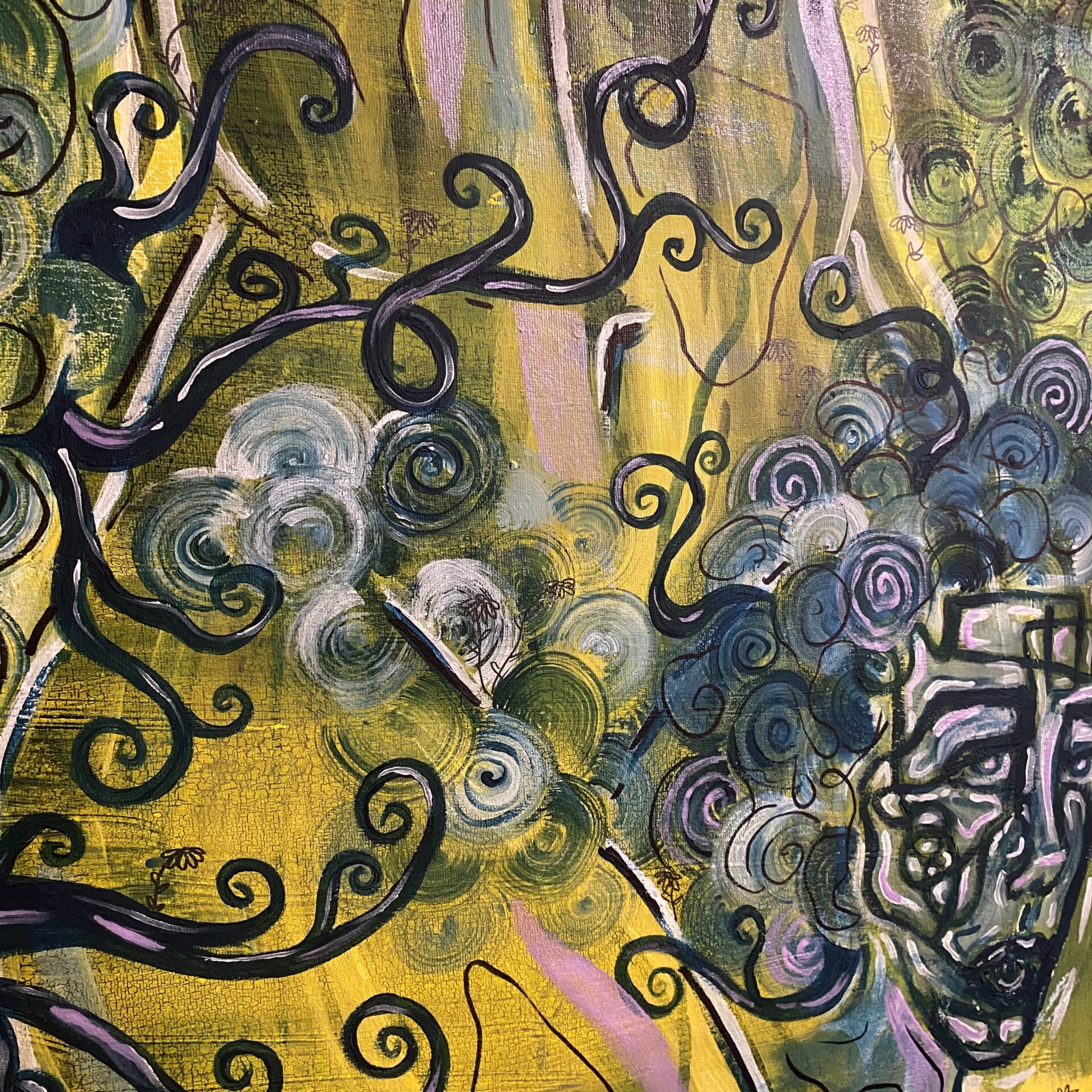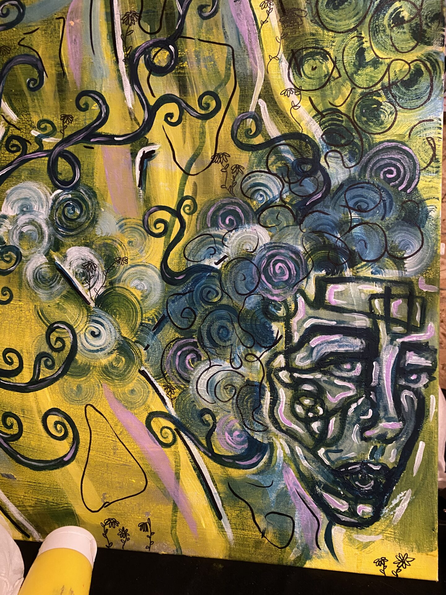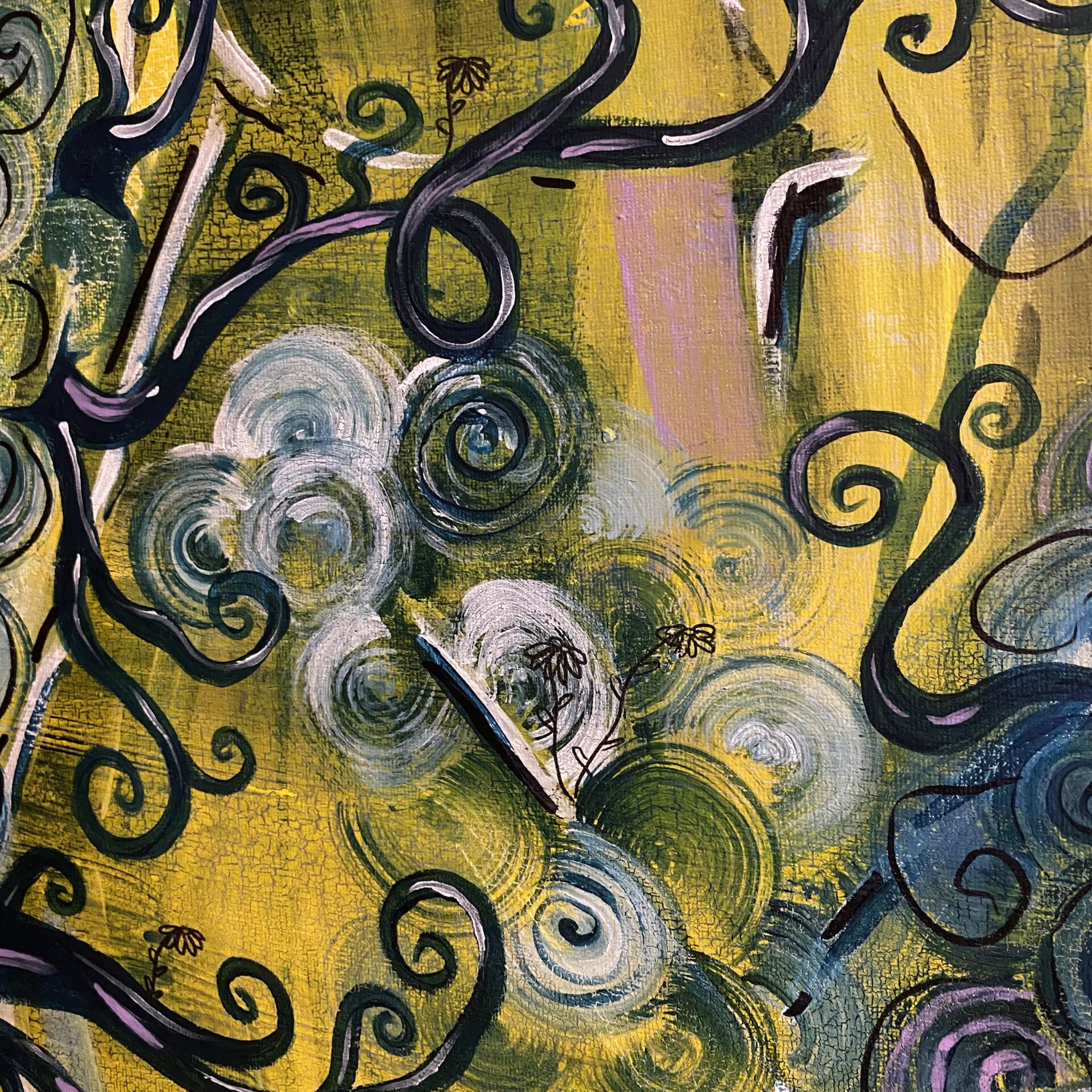 “Plątanina”- obraz tworzyłam przez łącznie, około trzy miesiące. Połączyłam wiele różnych technik oraz tekstur, aby obraz miał swój własny unikalny charakter. Moja sztuka nie ma reguł ani ścisłych teorii, jest w pełni wolna. Tekstura obrazu łączy w sobie spękania, połysk, wypukłości, farbę, marker… Każdy mój obraz powstaje pod wpływem różnych emocji, można to zauważyć na pierwszy rzut oka. Dodatkową ciekawą cechą obrazu są różne kontrasty kolorystyczne.